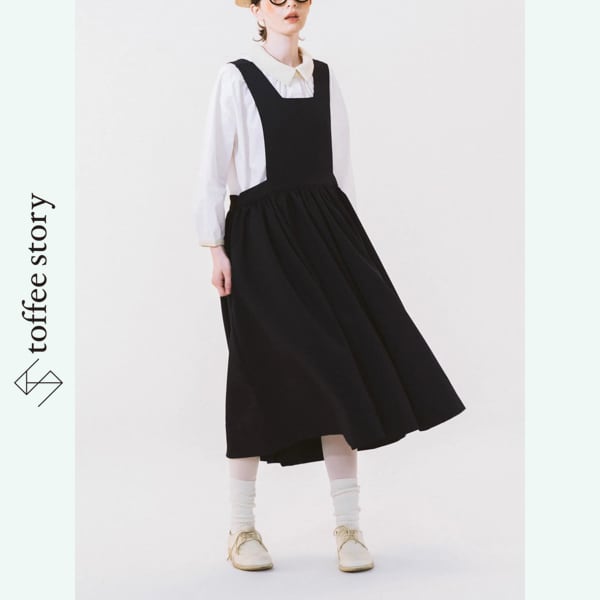 深いネイビーブルーの余白が印象的な、WOKERKERが描くサロペットワンピース