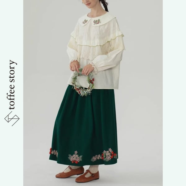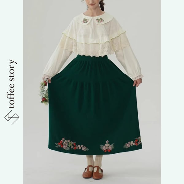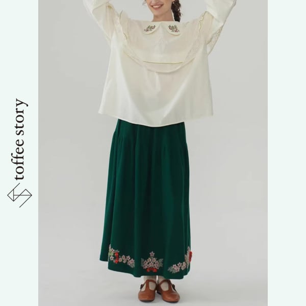 深翠に咲く花の詩ウール刺繍スカート 《Y0353》