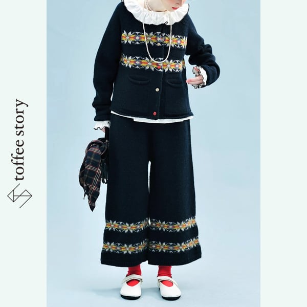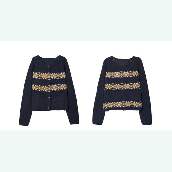 夜の静けさを思わせるディープネイビーのニットに、光のような色糸が踊るimakokoniのアートカーディガン。