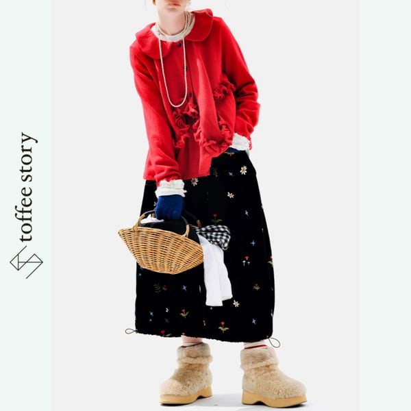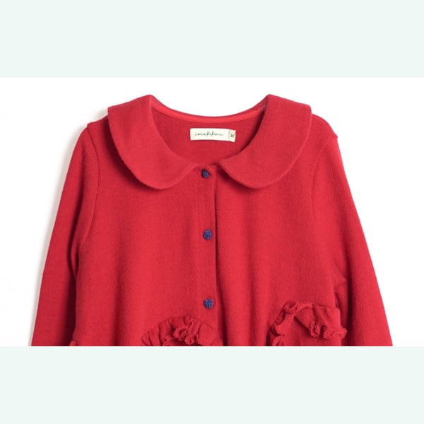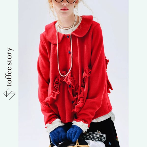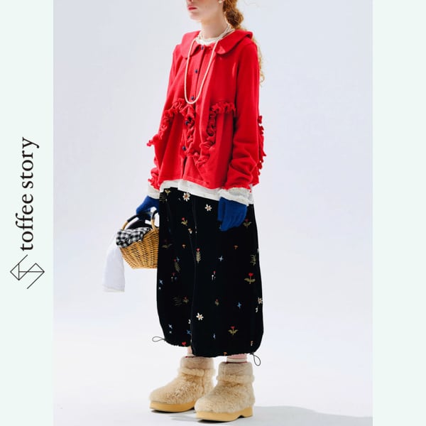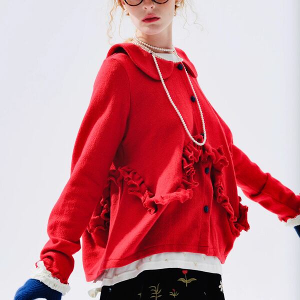 甘さの中に遊び心が潜み、ボタンのさりげない色使いが表情に変化を添えます。