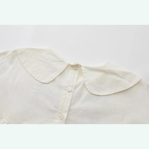 柔らかな生成色の生地に、ふんわりと重ねられたフリルと繊細なレースが優雅に揺れます。襟元には熟れた果実のようなプラムの刺繍が咲き、甘やかなアクセントに