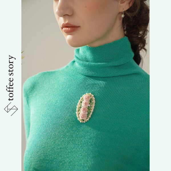 柔らかく身体に馴染むリブ編みの生地に、胸元の小花装飾がそっと咲く一着です。淡いピンクの花々はアンティークのブローチを思わせる上品な佇まい
