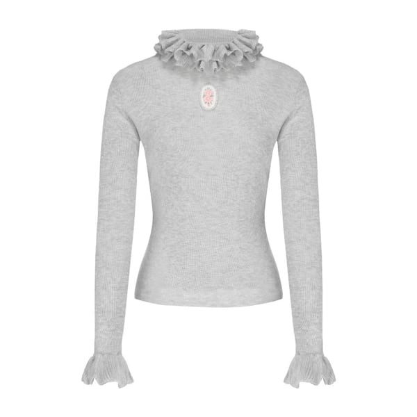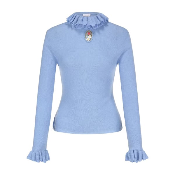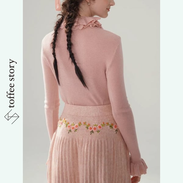 Facer Yisenが紡ぐ、優雅な夢をまとうニットトップ。首元と袖口にふんわりと重ねられたフリルが、まるで絵本の中のワンシーンのようなやさしさを添えます