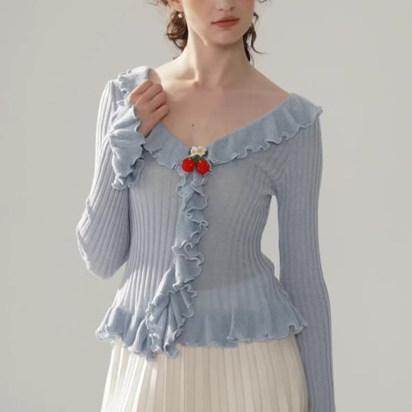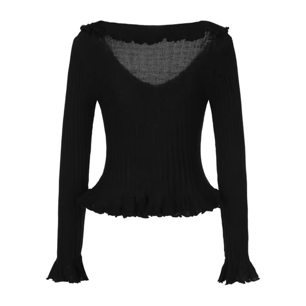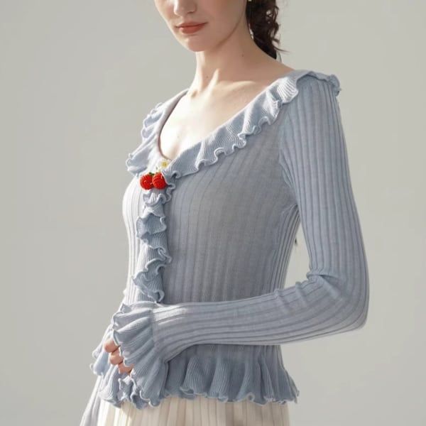 Facer Yisenの世界観を映し出す、遊び心と優美さが共存するニットトップス。深めのVネックに沿って波打つようにあしらわれたフリルが、動きに合わせて軽やかに揺れ、ロマンティックな印象を引き立てます