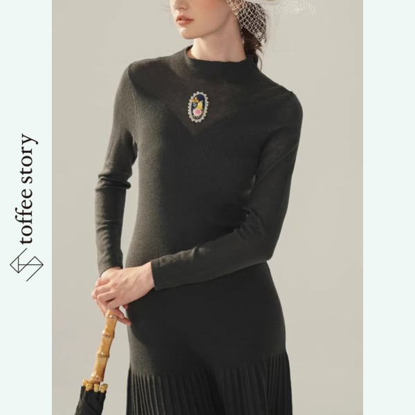胸元に咲くブローチのような刺繍フラワーが、静かな可憐さを添えるロングニットワンピース。繊細な透け感と切り替えラインの陰影が優美な表情を描きます