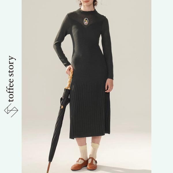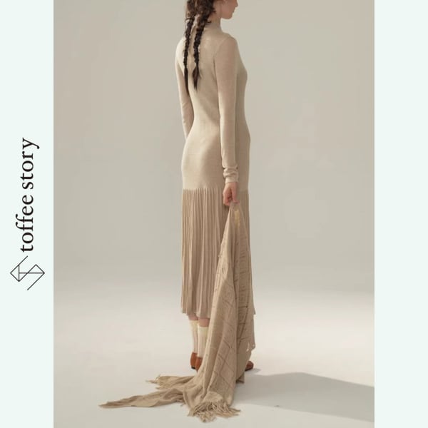 裾に向かって広がるプリーツ編みが歩みに揺れ、詩的な余韻を生むデザインも魅力のひとつ。立ち姿を美しく見せるシルエットと、Facer Yisenならではのロマンティックな装飾美が、日常にアートのひとしずくを添えてくれます