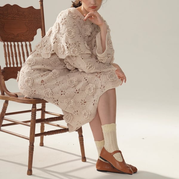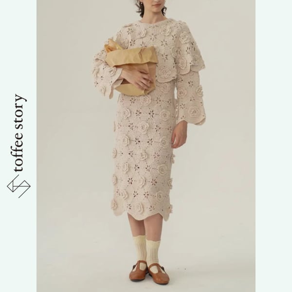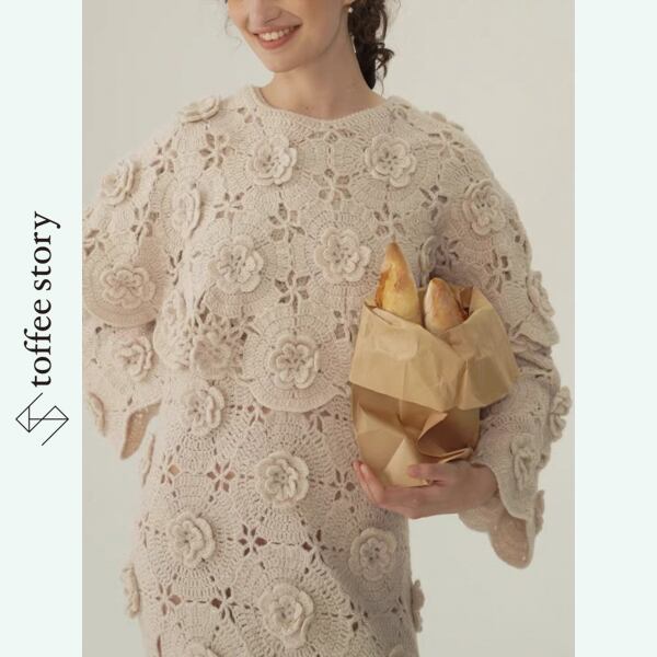 ベレー帽にも同じ編み模様が施され、全体に統一感のあるロマンティックな装いに