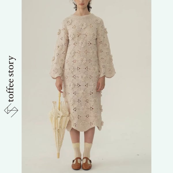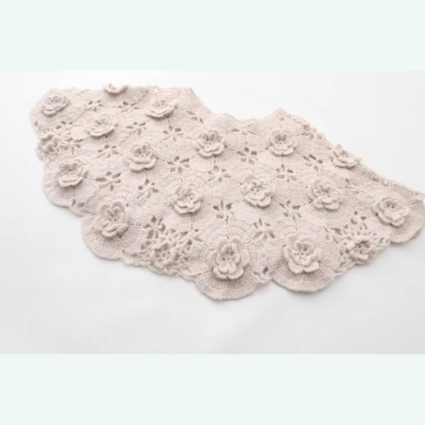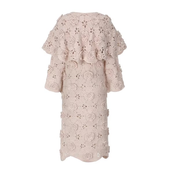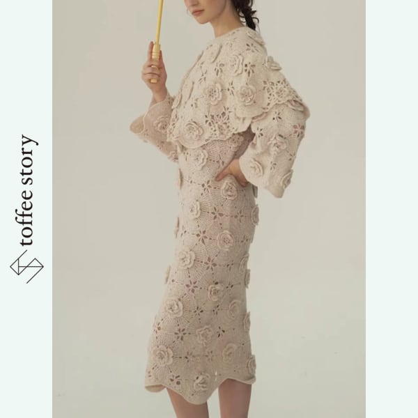 可憐な花模様が一面に咲き誇る、かぎ針編みのケープ付きニットワンピースとお揃いのベレー帽のセットです