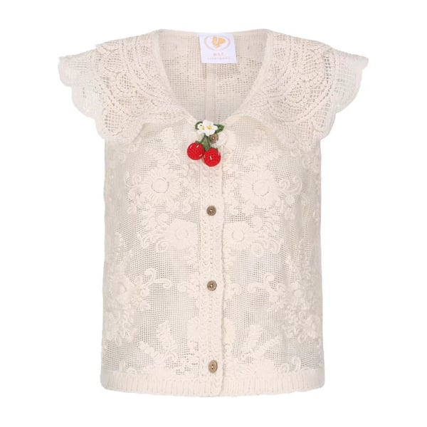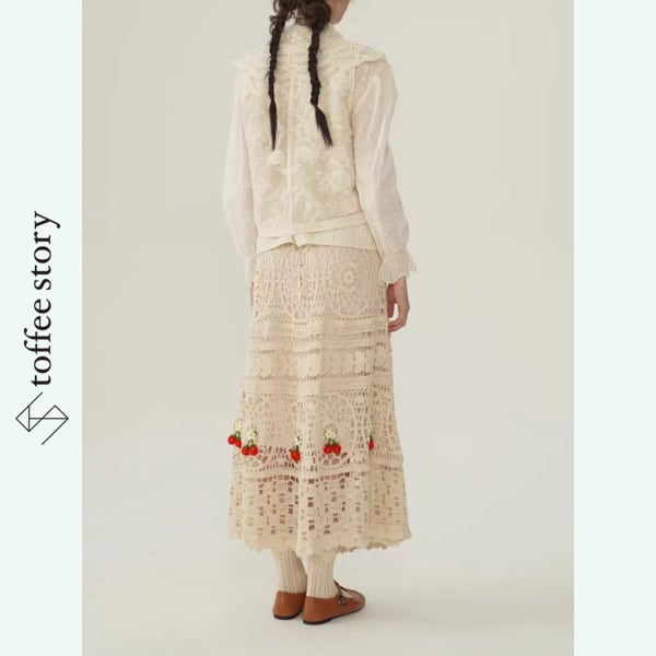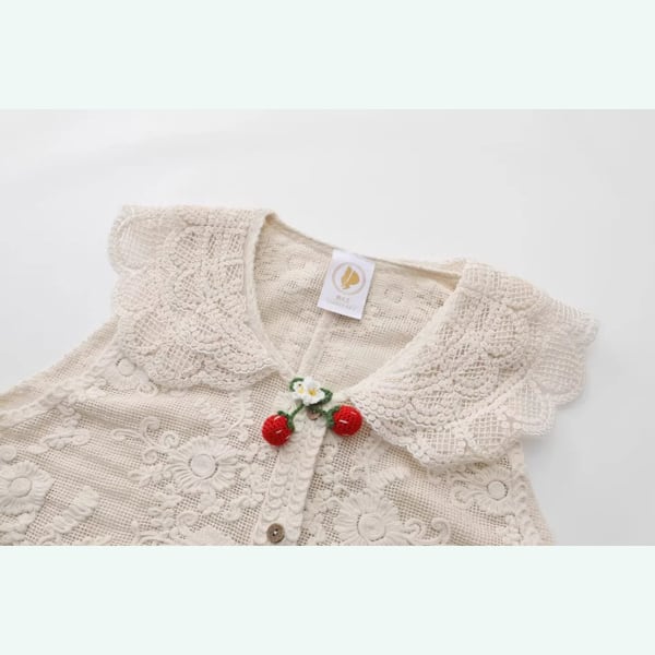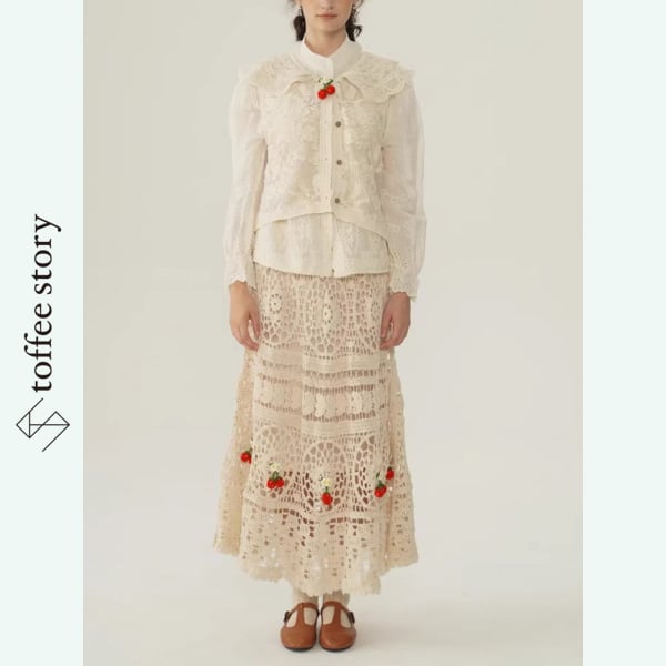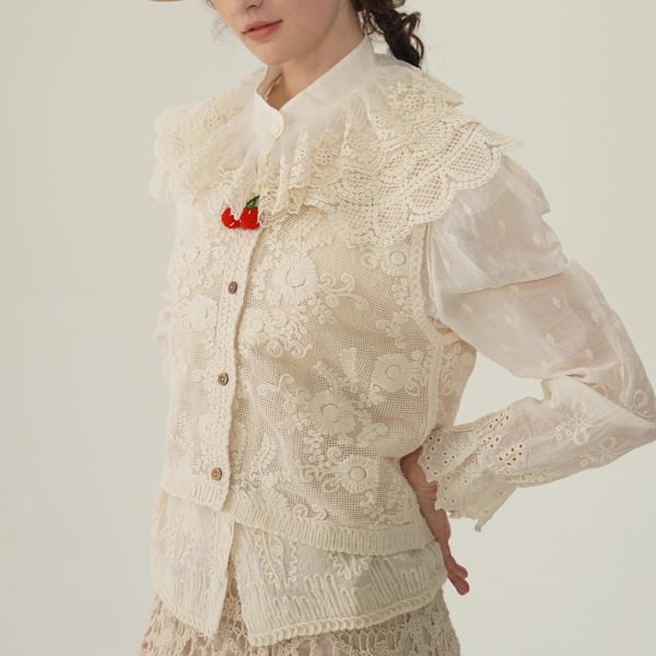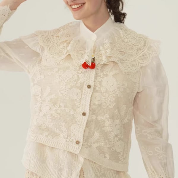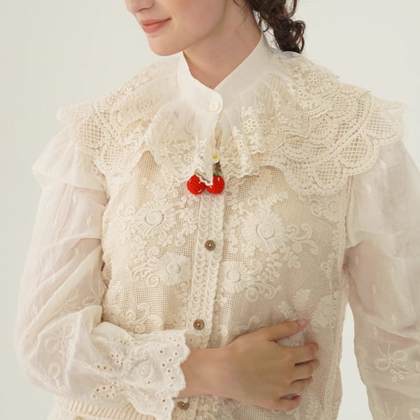 可憐なレースと繊細な編み模様が織りなす一枚。襟元に添えられた手編みのさくらんぼモチーフが、どこかノスタルジックで愛らしい印象を添えます