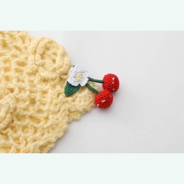立体的に編まれたお花のモチーフに、愛らしいさくらんぼの刺繍が添えられ、アンティークなムードにアートな遊び心を添えています。