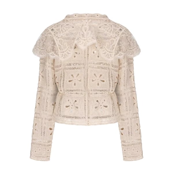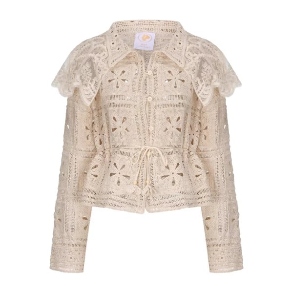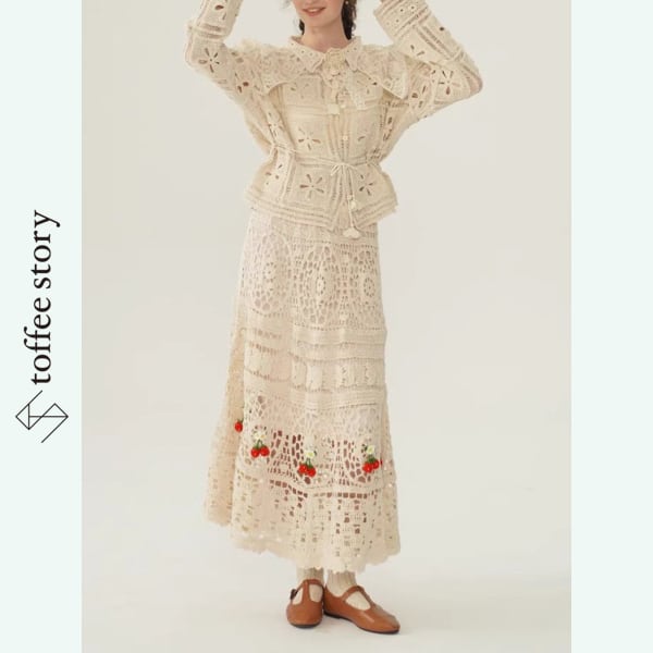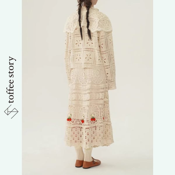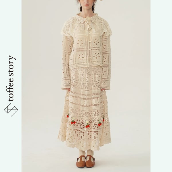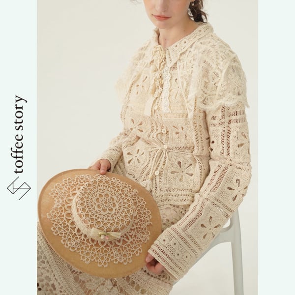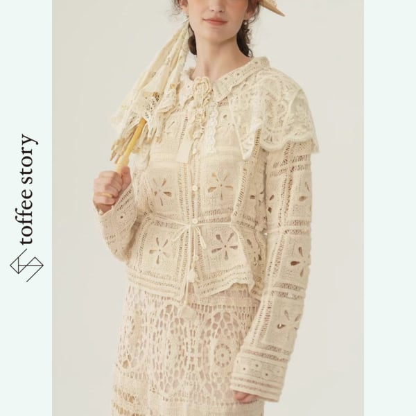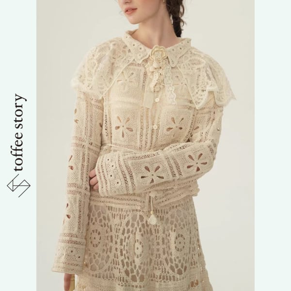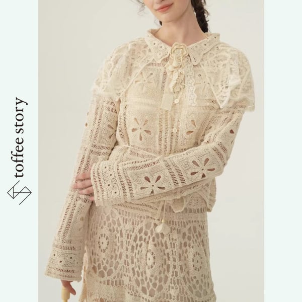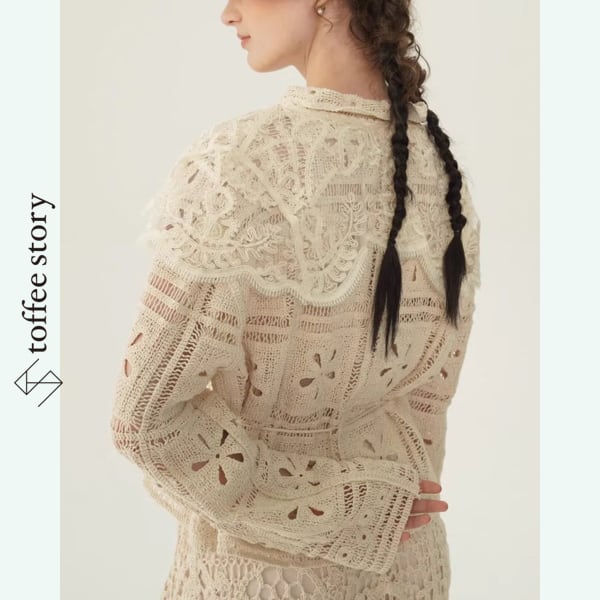 繊細なかぎ針編みとレースディテールが交差する、Facer Yisenならではのアートなブラウス。花のような模様が一面に広がり、アンティークの雰囲気を纏いながらも軽やかで洗練された佇まいです。