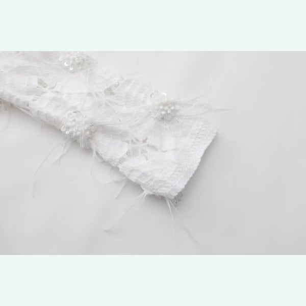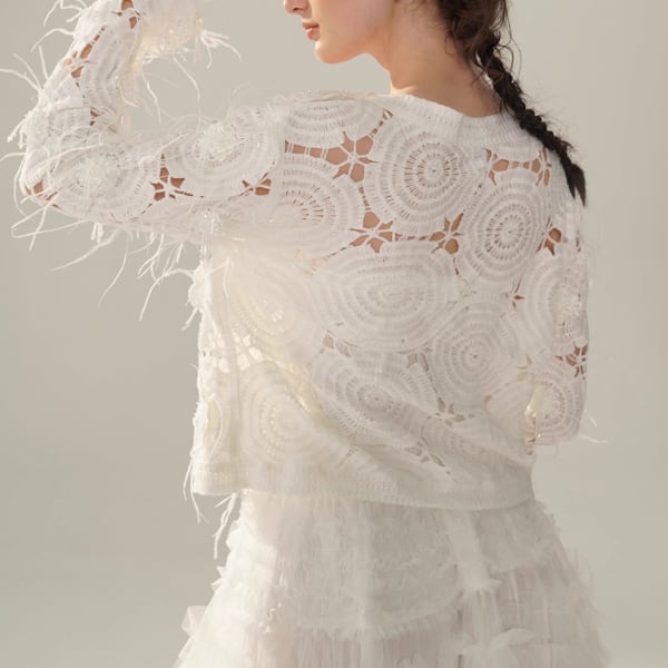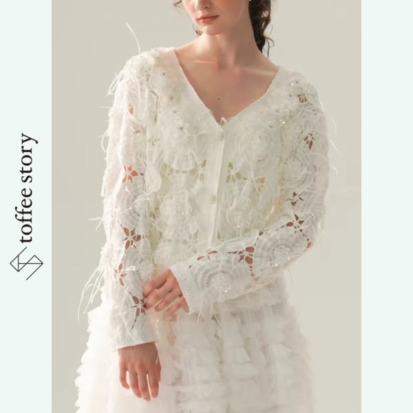 繊細なスパンコール刺繍と羽根のように舞うフェザーが織りなす、幻想的なカーディガン。