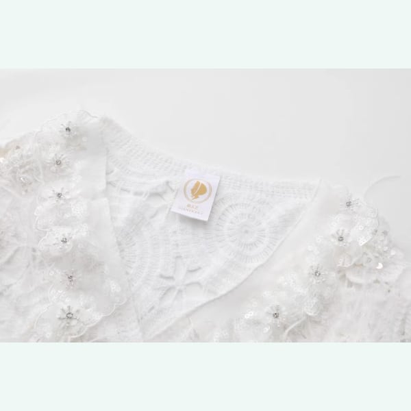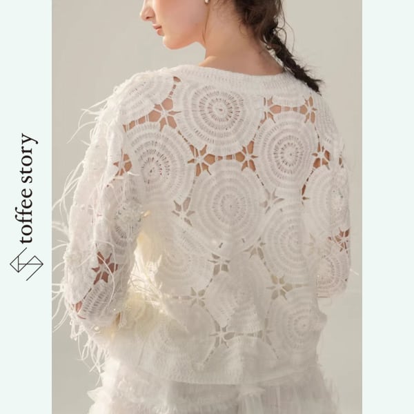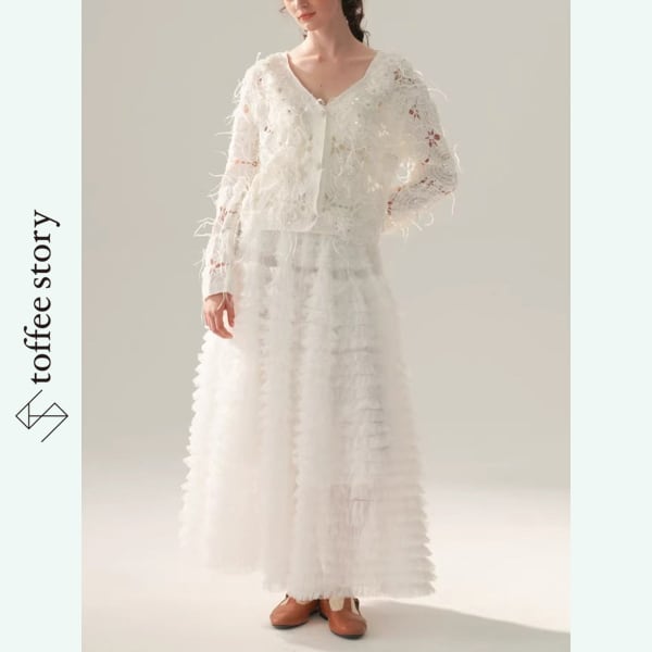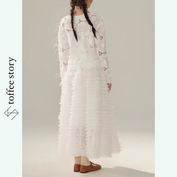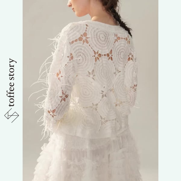 柔らかな透かし編みと光を集める装飾が、まるで夢の中のドレスのような雰囲気を纏わせてくれます。