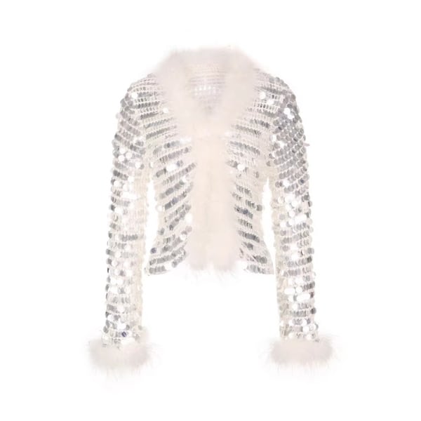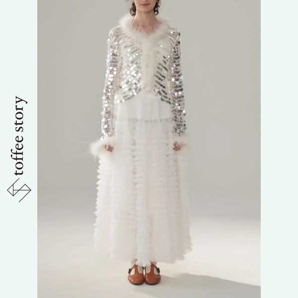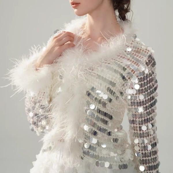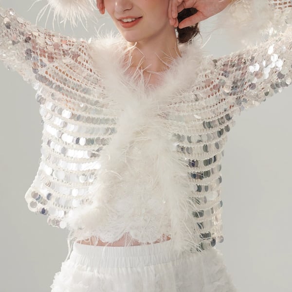 繊細な羽根のようなファーと、きらめくスパンコールが光を優しく反射する、幻想的なカーディガン。