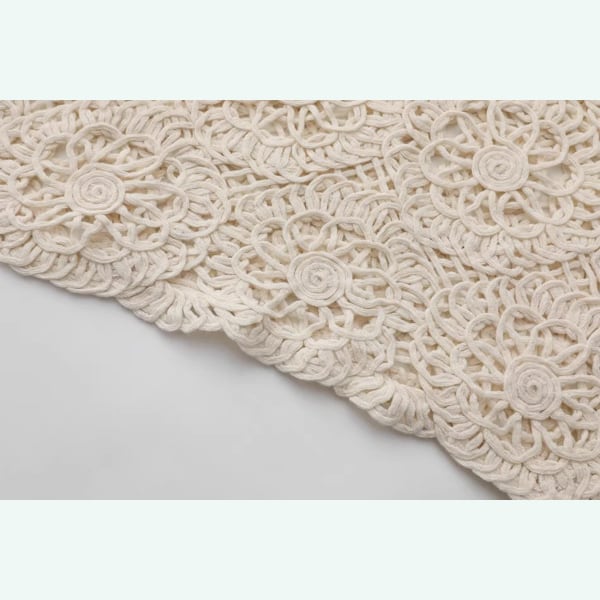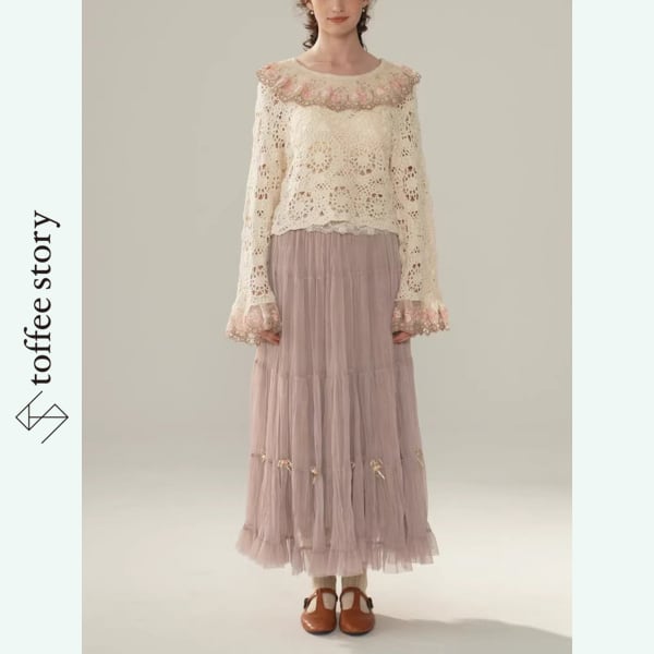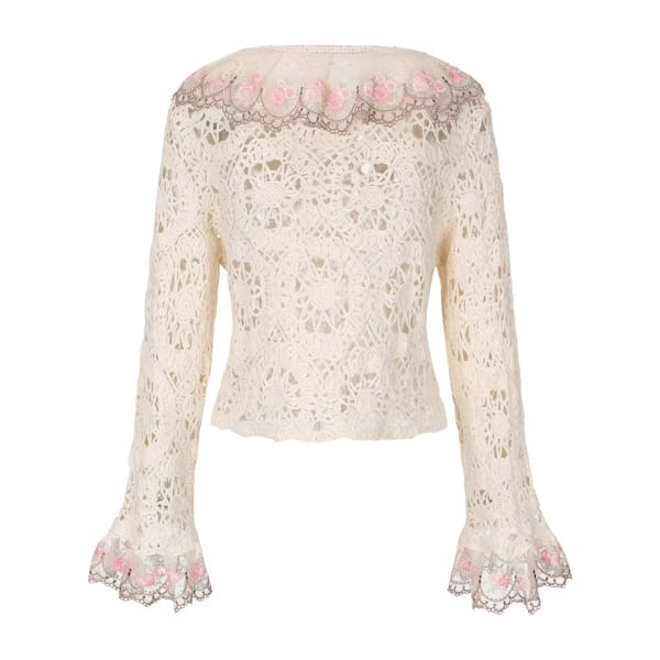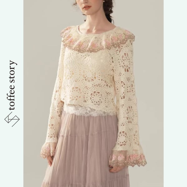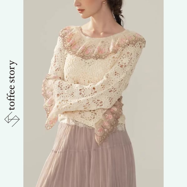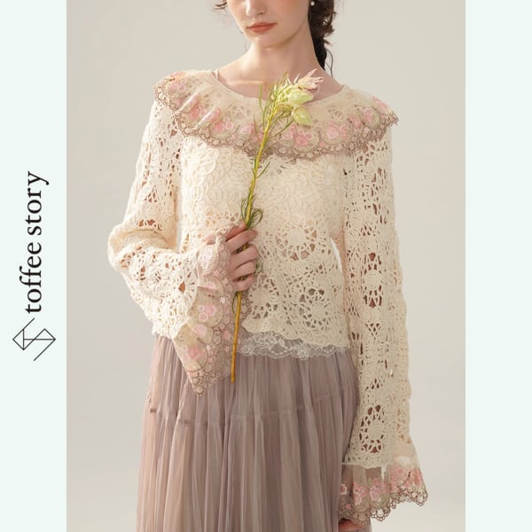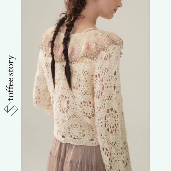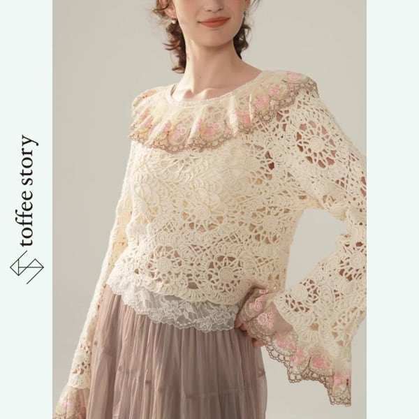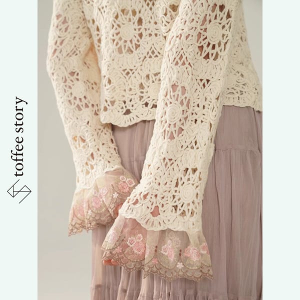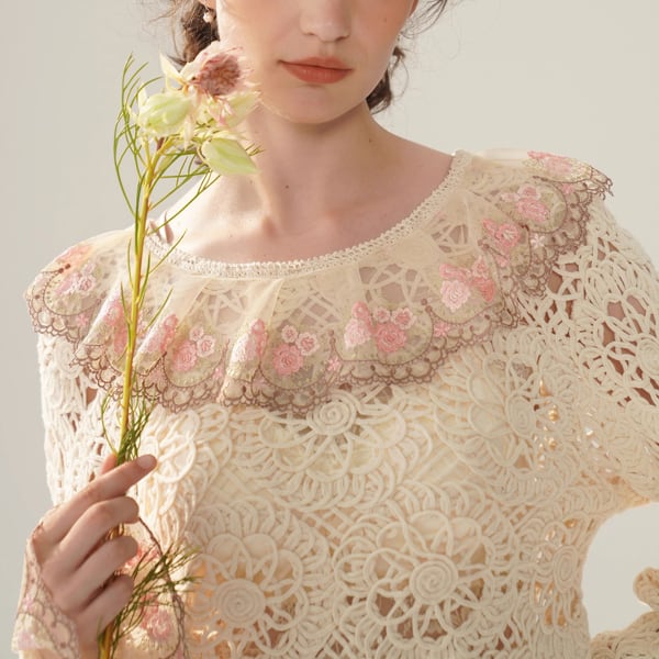 繊細なかぎ針編みレースと、袖や襟元に咲く可憐な花々が美しい、Facer Yisenらしいロマンティックな一着。