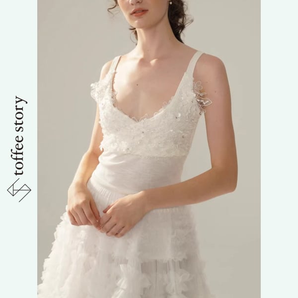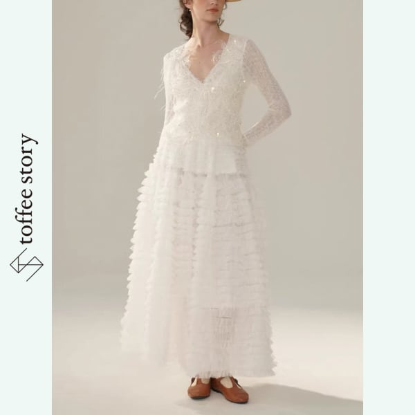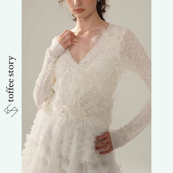 やわらかな透け感をもつ生地に、職人技が光る刺繍と繊細なビジューが散りばめられ、静かな輝きを放ちます。