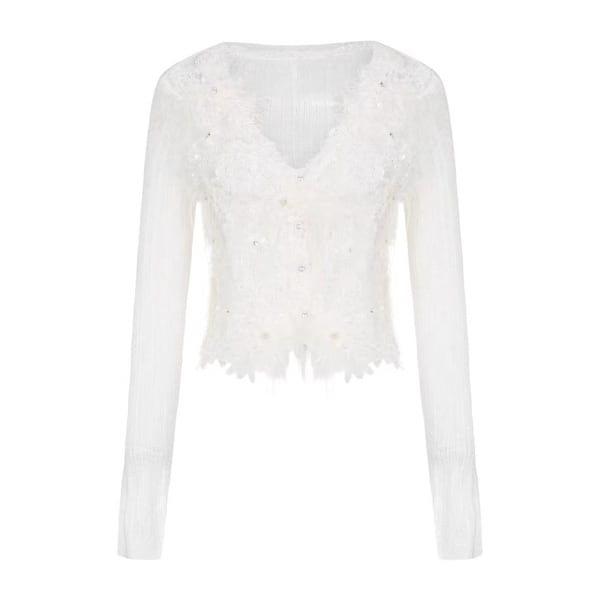 繊細なフェザーとスパンコール刺繍が胸元から裾にかけて優しく舞う、ロマンティックなVネックカーディガンとキャミソールのセットアップです。