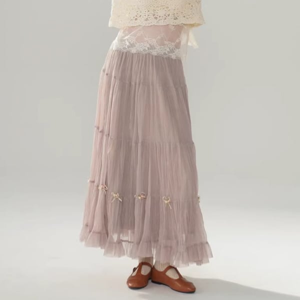やわらかなチュールにふわりとあしらわれた小さなリボンが、歩くたびに優しく揺れ、まるで詩の一節のような可憐さを演出します。