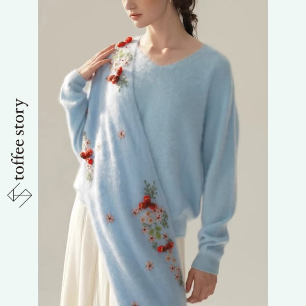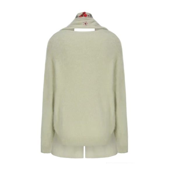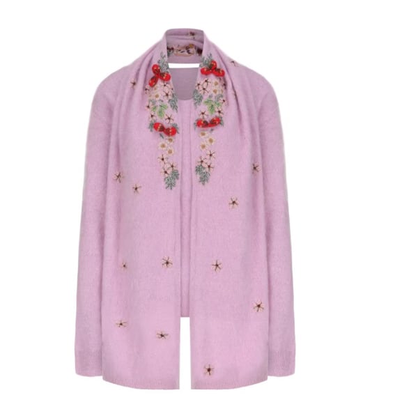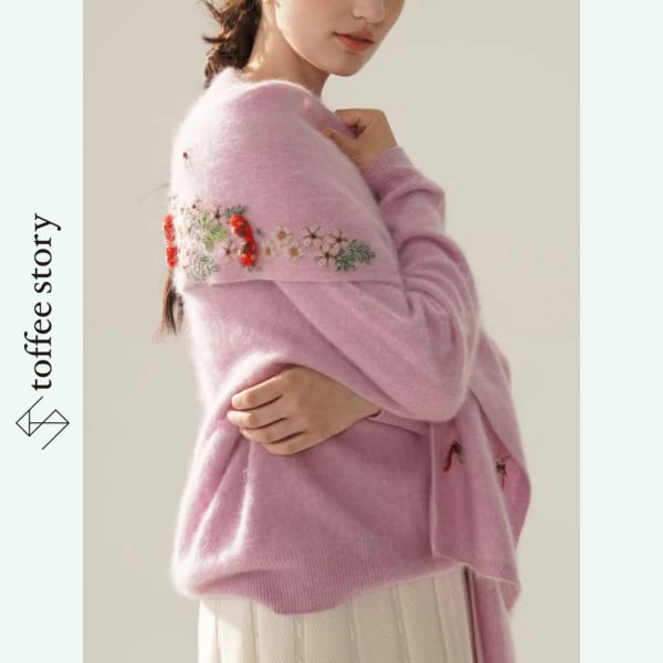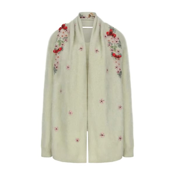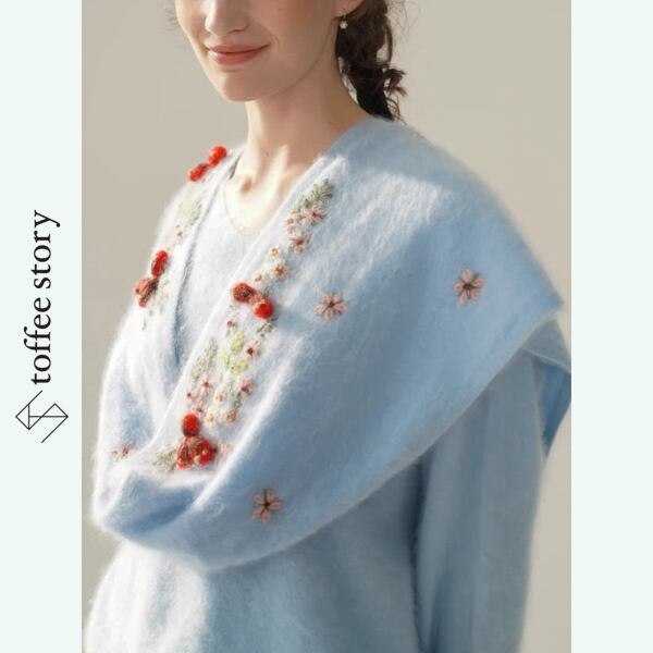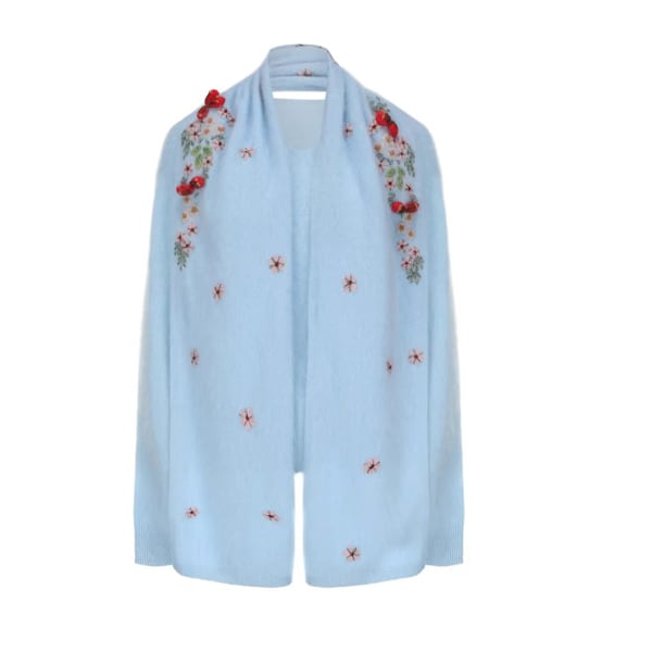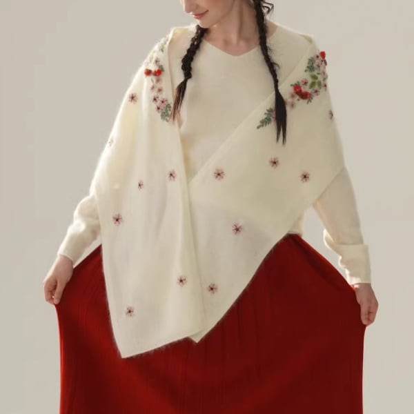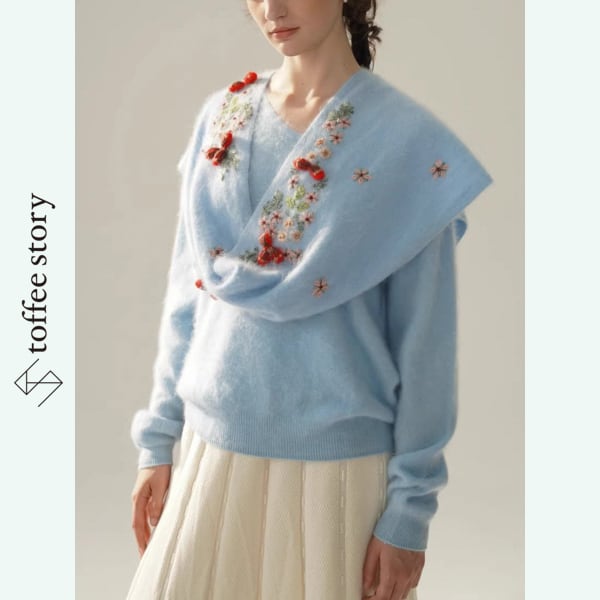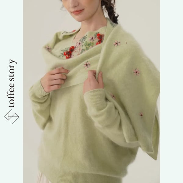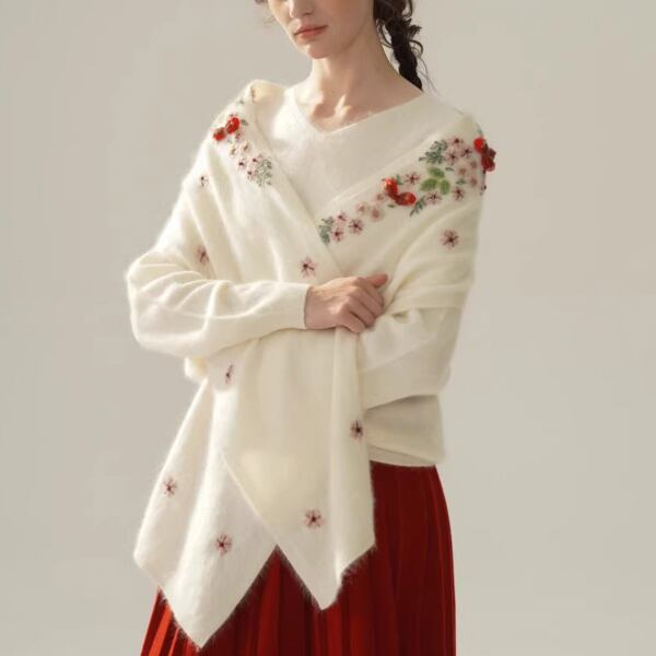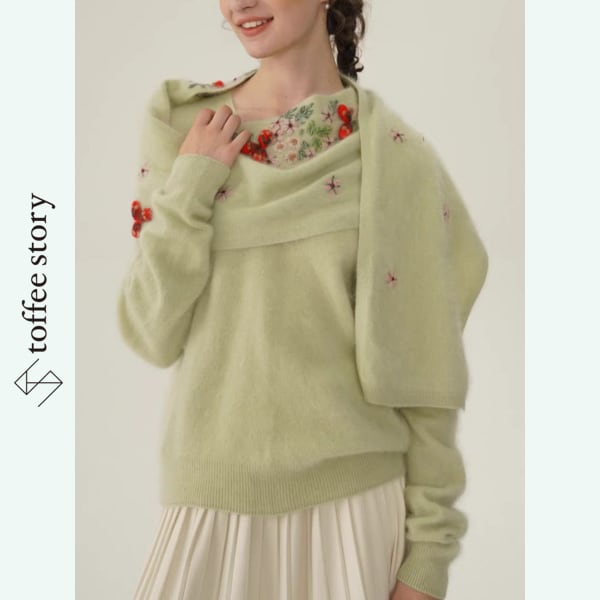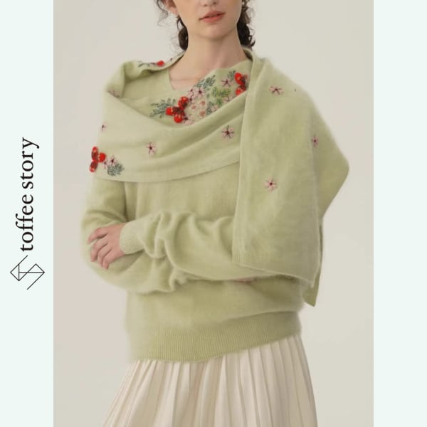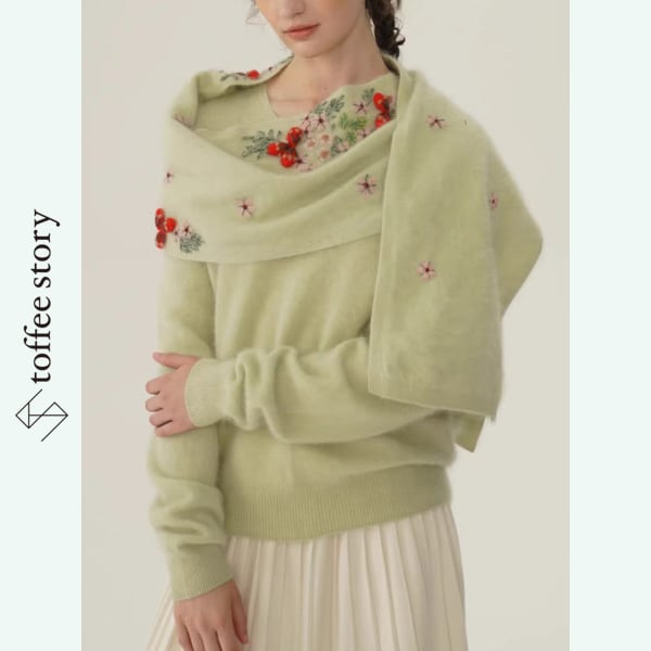 Facer Yisenが贈る、繊細な小花刺繍が印象的なニットとショールのセットです。