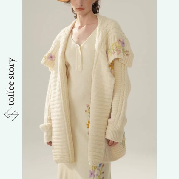 ざっくりとしたシルエットでありながら、細やかな編み模様が品よく調和し、日常に寄り添う一着に。背中までふわりと覆う大判カラーも、後ろ姿に物語を添えてくれます。