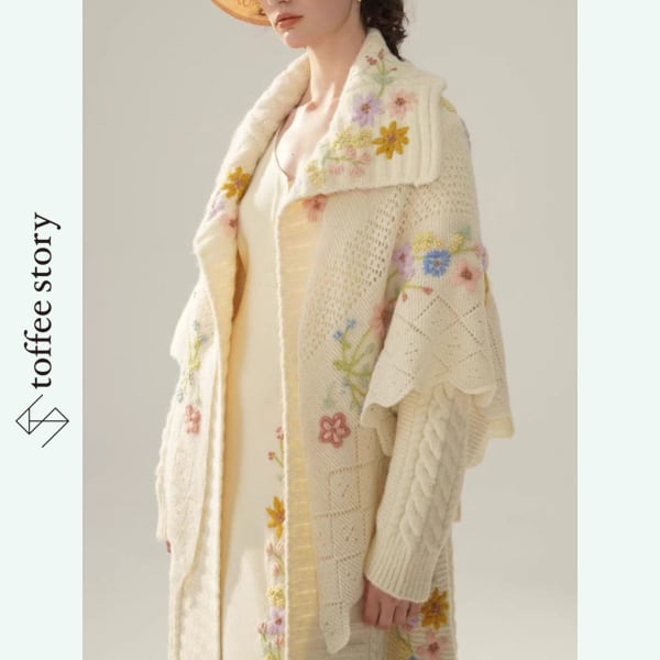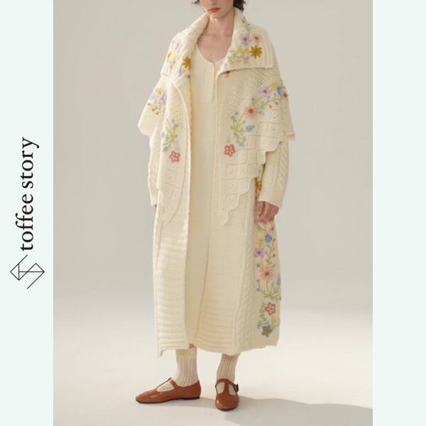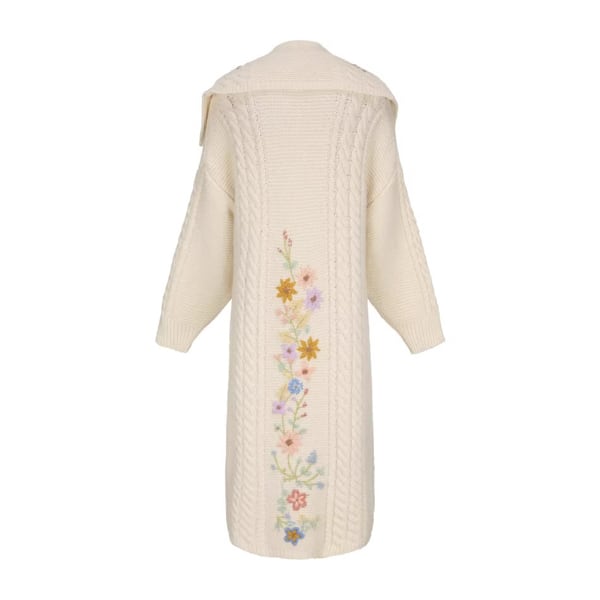 繊細な小花の刺繍が袖から裾にかけて咲き広がる、Facer Yisenのロングカーディガン。