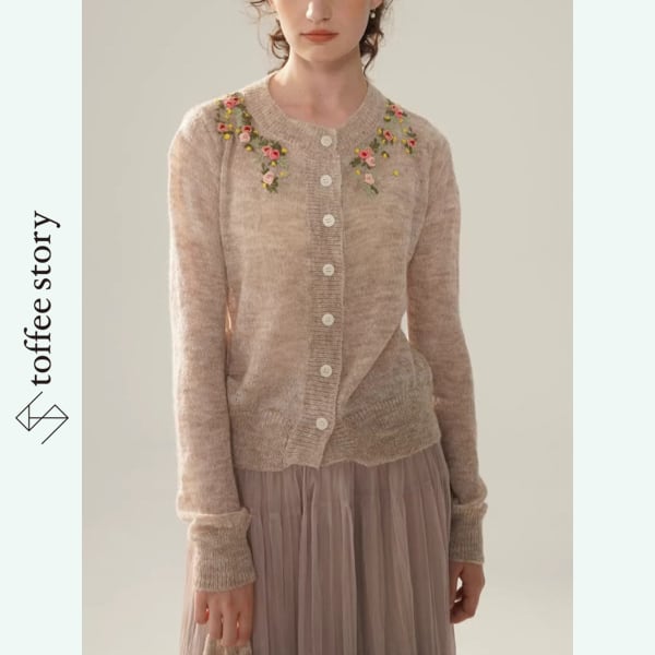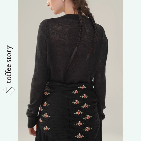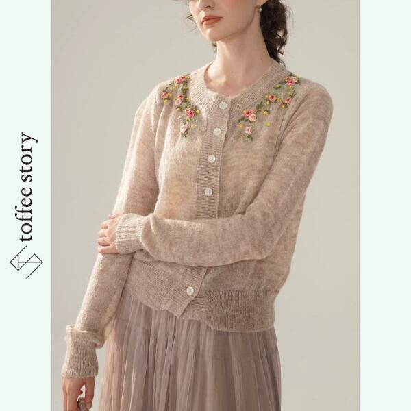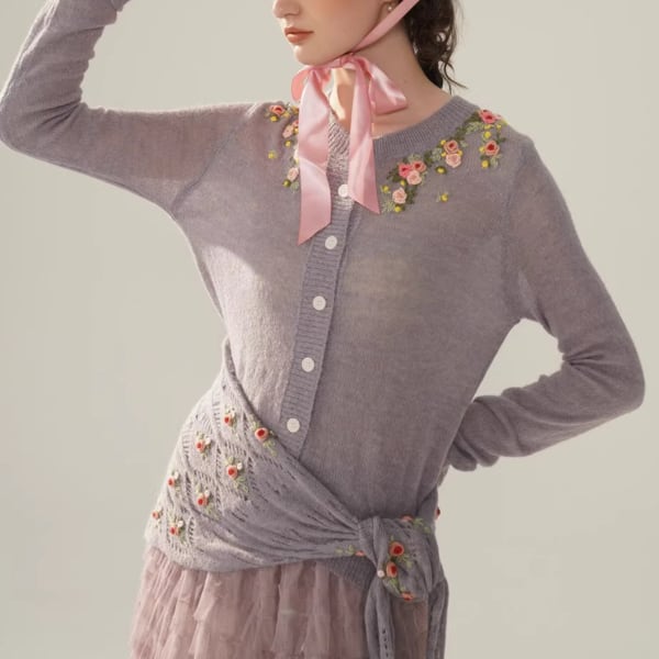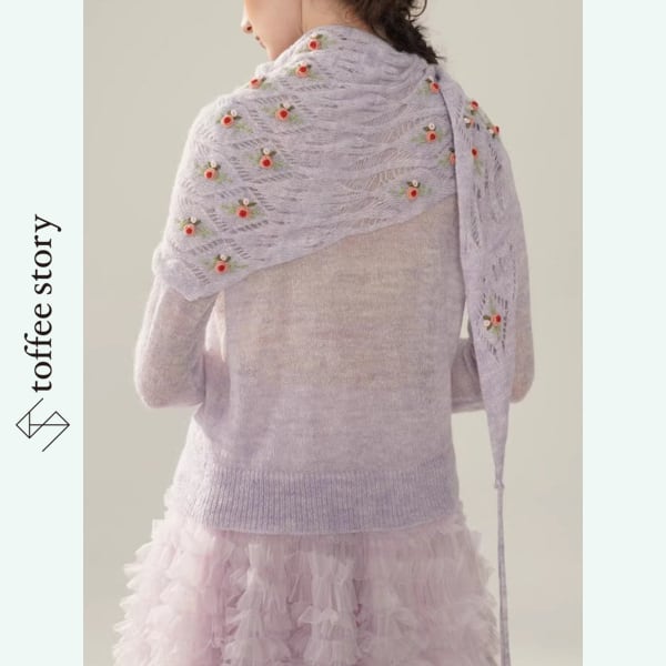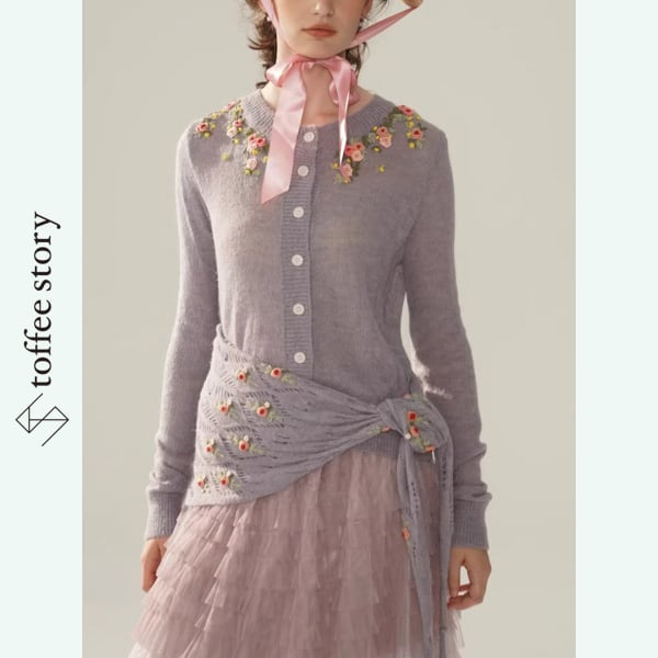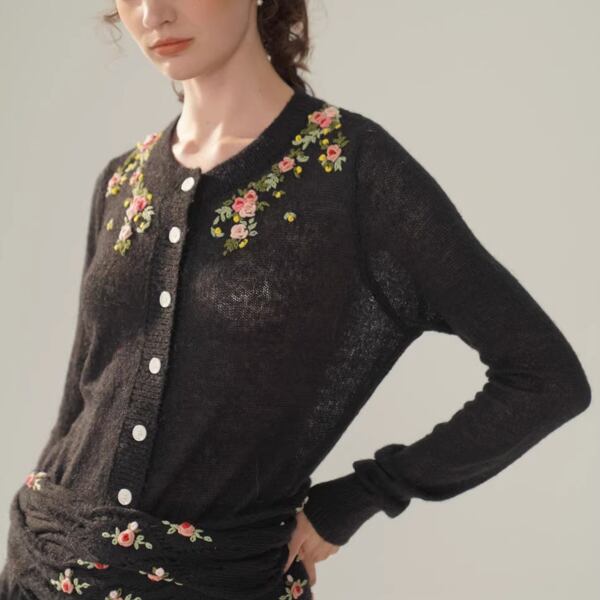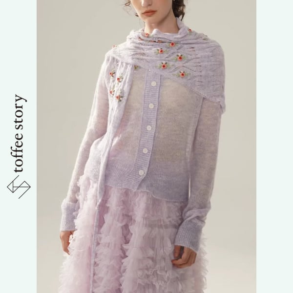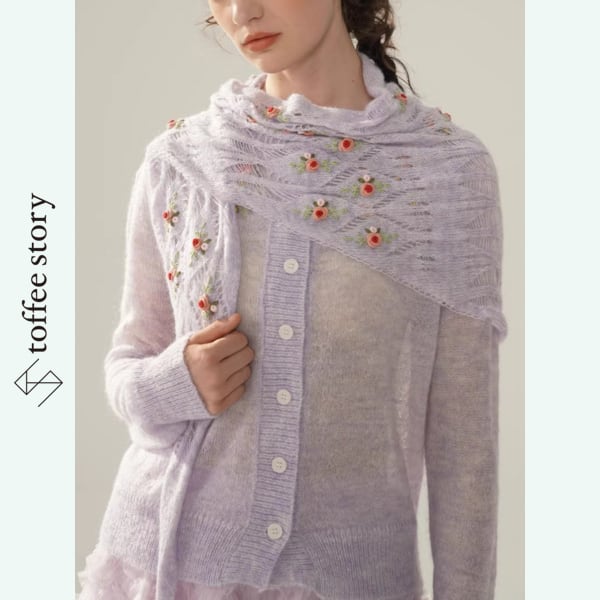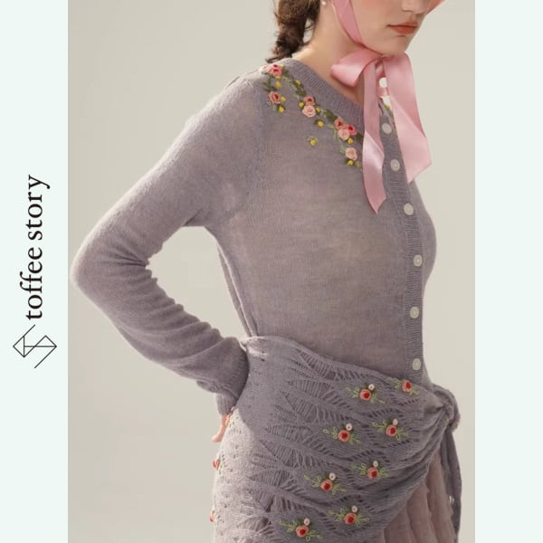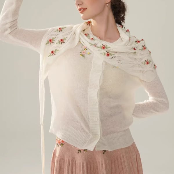 透け感のあるやわらかな編地に、繊細な小花刺繍が美しく咲きこぼれるニットカーディガン&ショールのセット。優雅に広がるシースルー素材が肌に溶け込むように馴染み、まるで花々と語らうような着心地です。クラシカルなシルエットと手仕事の温もりが融合したFacer Yisenならではの一着。甘すぎず、心に残るアートな一枚を纏って。
