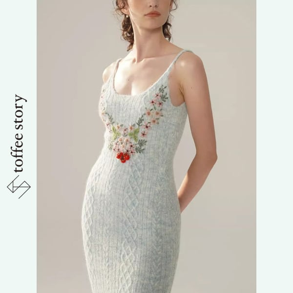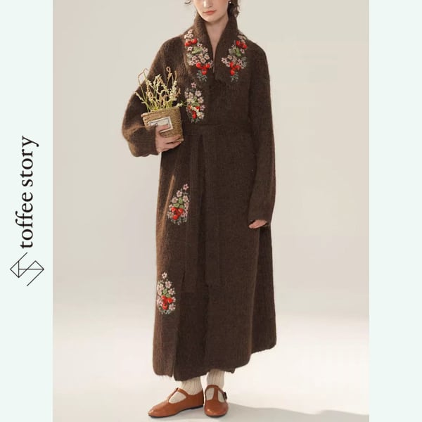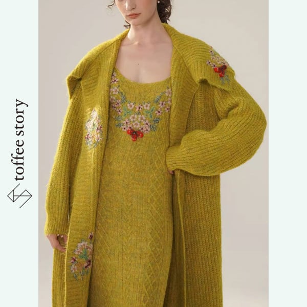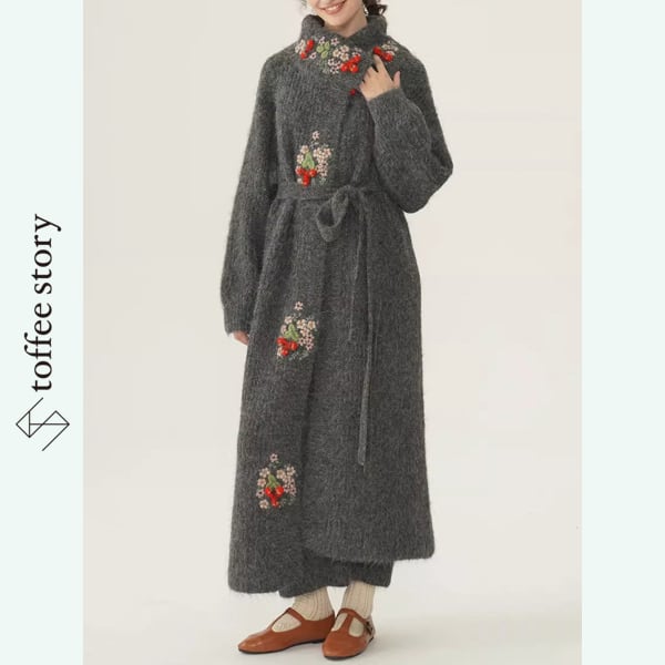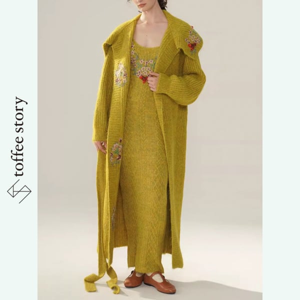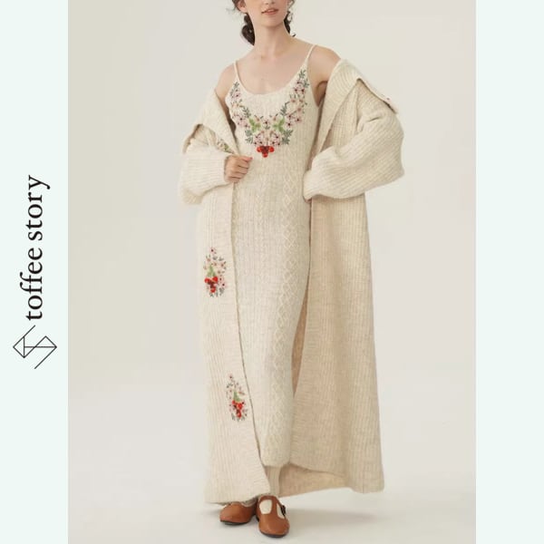 胸元に咲く可憐な小花刺繍が印象的なロングニットワンピースと、同柄の刺繍があしらわれたローブコートの2点セット。
