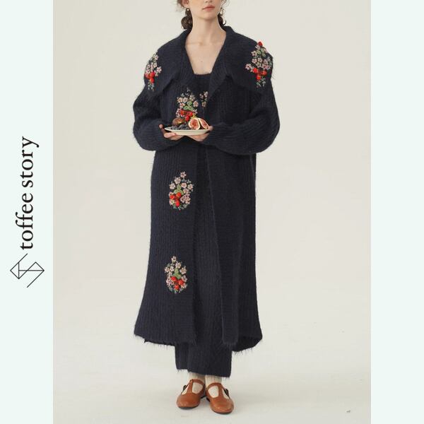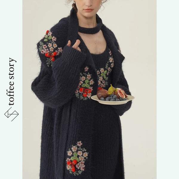 花々が寄り添うように並ぶ立体刺繍と、柔らかく編まれたニット地が調和し、クラシカルな優美さを引き立てます。