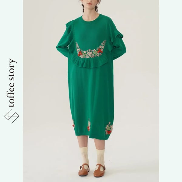 フリルと花刺繍のロングニットワンピ 《Y0420》