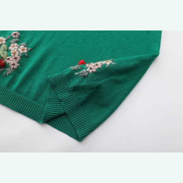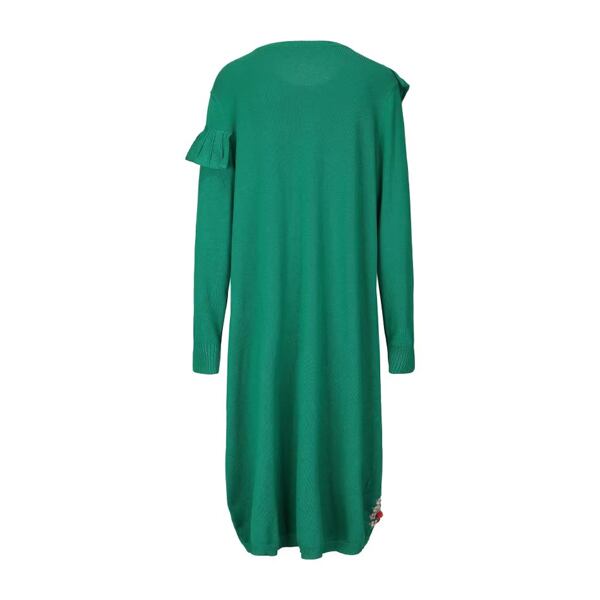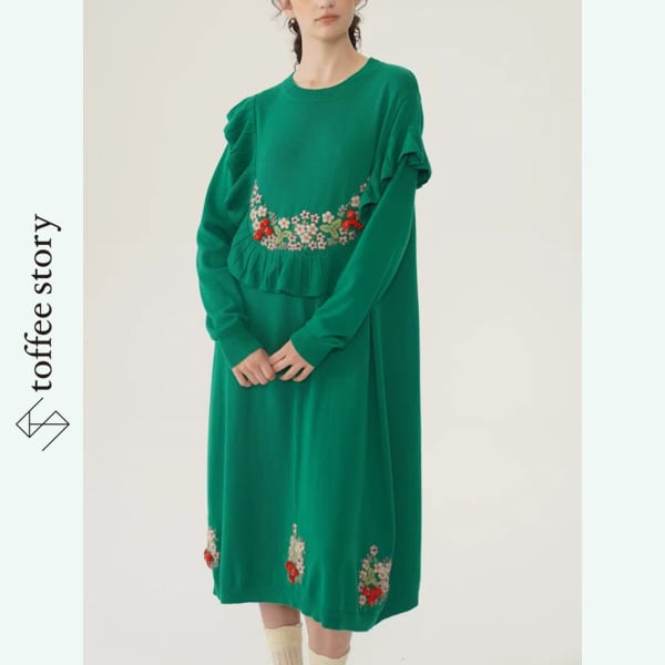 立体的なフリルが胸元と袖に優しくあしらわれ、手刺繍の小花モチーフがロマンティックな彩りを添えるロングニットワンピース。
