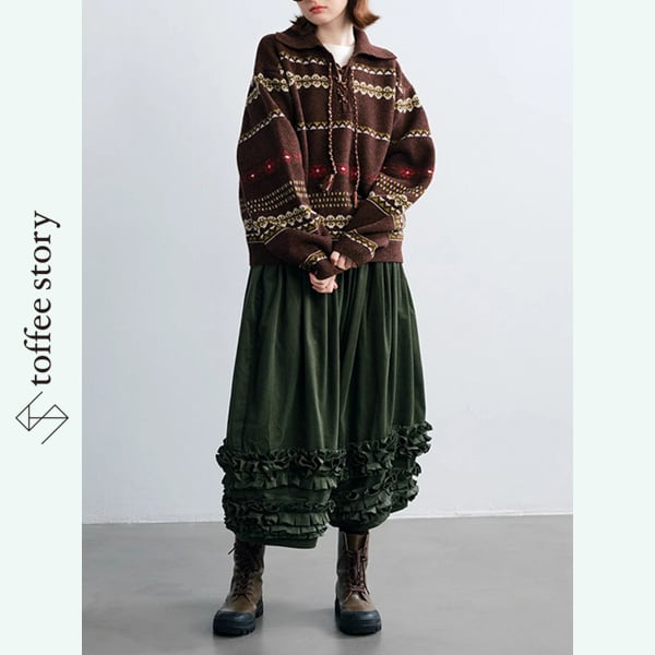 まるで秋の森を閉じ込めたような、あたたかなブラウンに小花模様が咲くPIGGIE PIGGIEのニットプルオーバー。