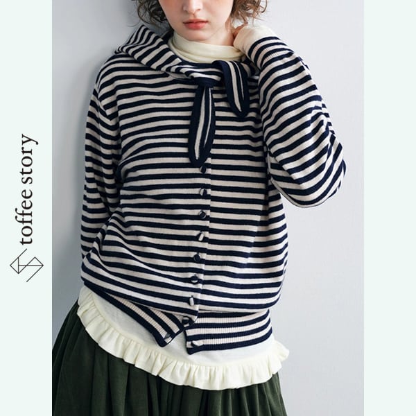 クラシックなボーダー柄に、リボンを結んだような襟元が印象的なPIGGIE PIGGIEのニットカーディガン。