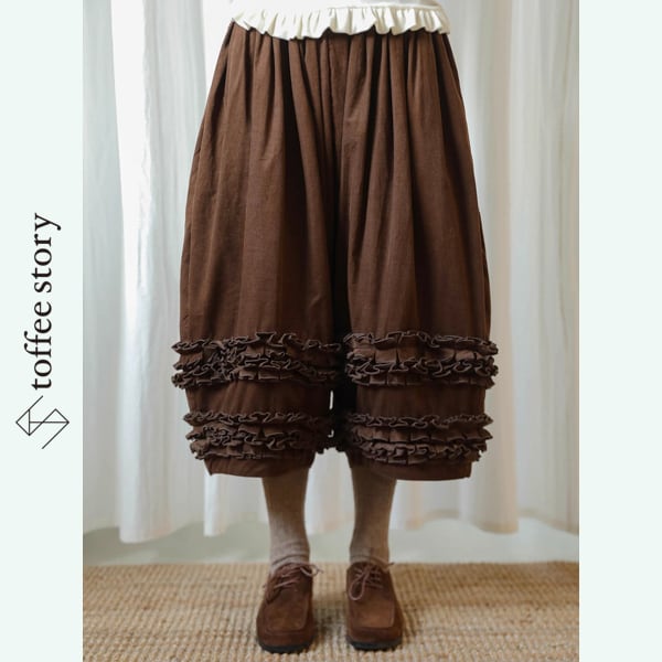 裾に重ねられた細やかなギャザーが、静かな木陰の風を思わせるPIGGIE PIGGIEのクロップドパンツ。