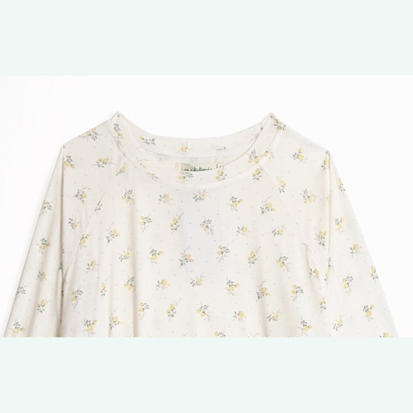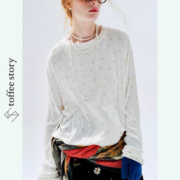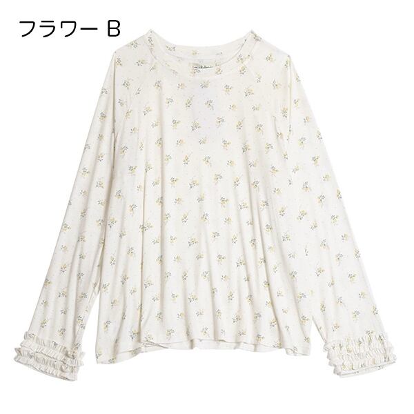 袖口のフリルが印象的な、imakokoniの花柄ロングTシャツ。
