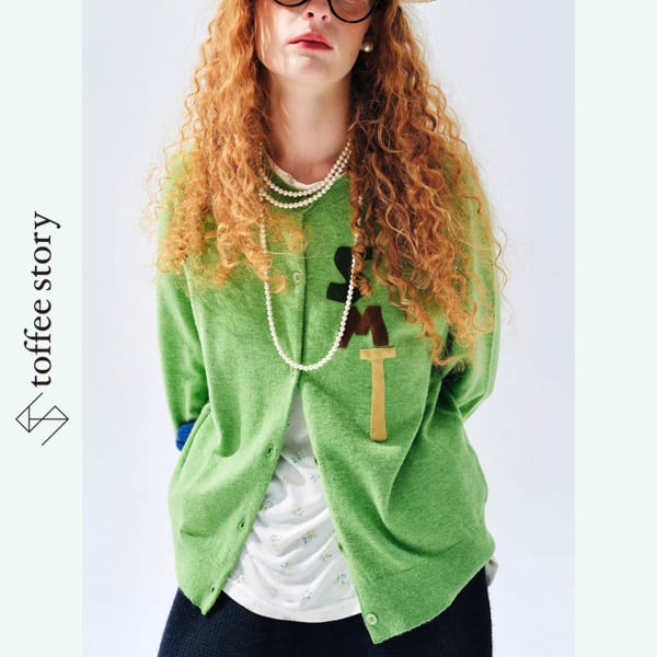 柔らかなグリーンに遊び心あふれるレターアップリケを散りばめた、imakokoniのアートカーディガン。
