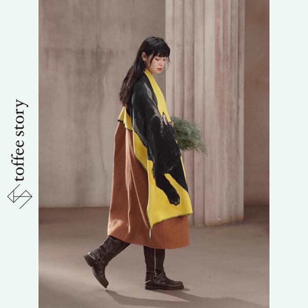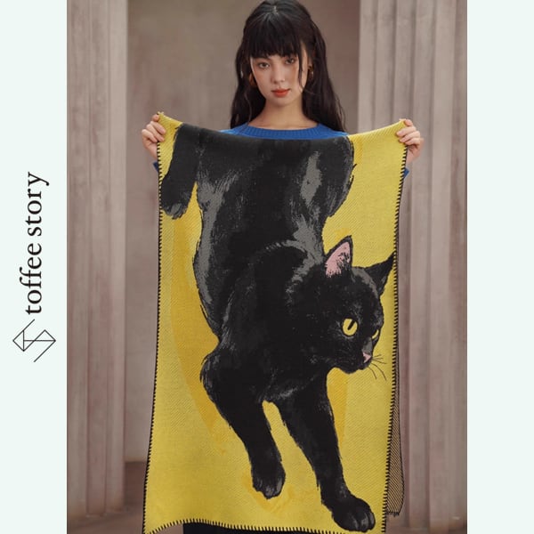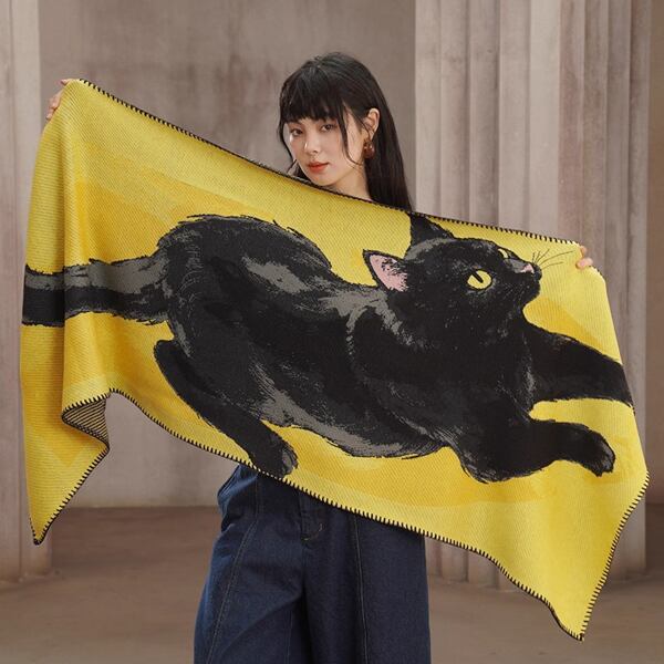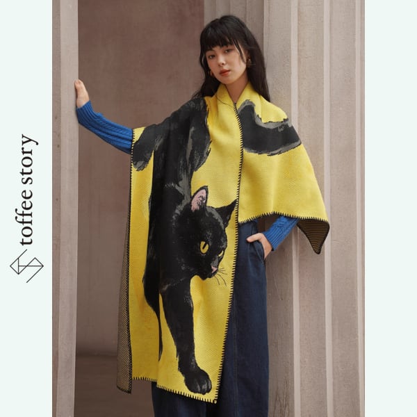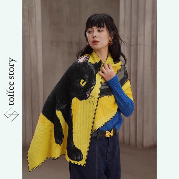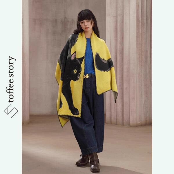 黄金のイエローが放つ温もりと、黒猫の艶やかなシルエットが織りなすコントラストは、纏う人の個性をやさしく引き立てます。