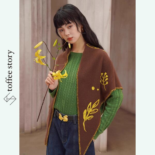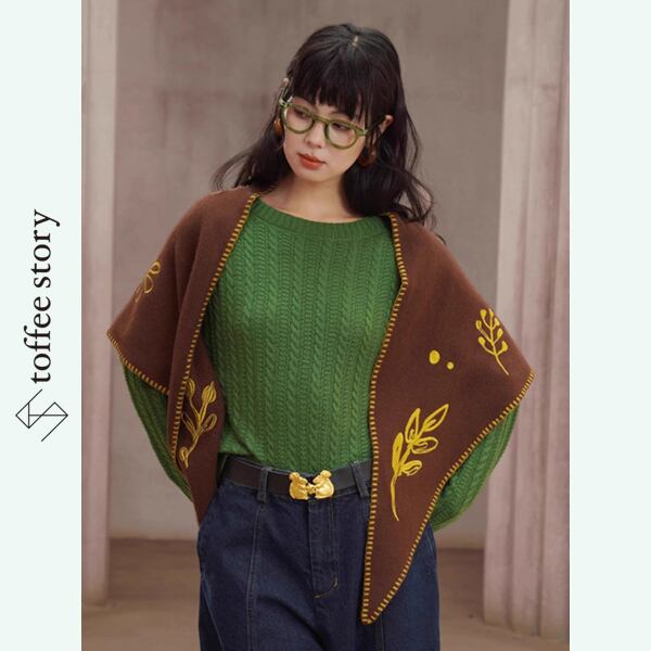 風が通り抜ける庭の片隅で、草の香りとともに編まれたようなケーブルニット。