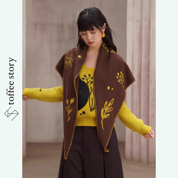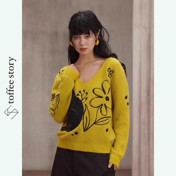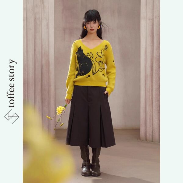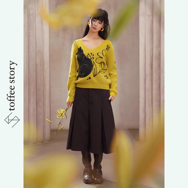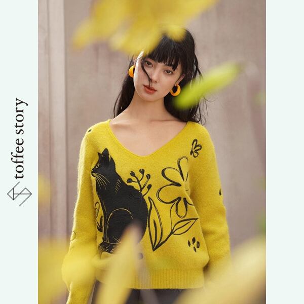 CAMOOONIが描くこのニットプルオーバーは、柔らかなマスタードカラーを舞台に、黒のラインで花々と猫の姿を繊細に描き出したアートのような一枚です。