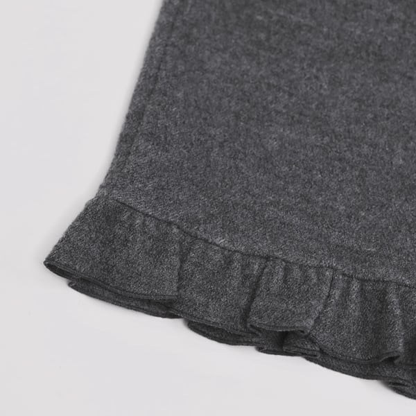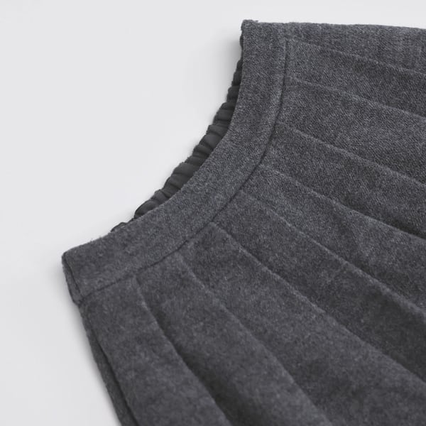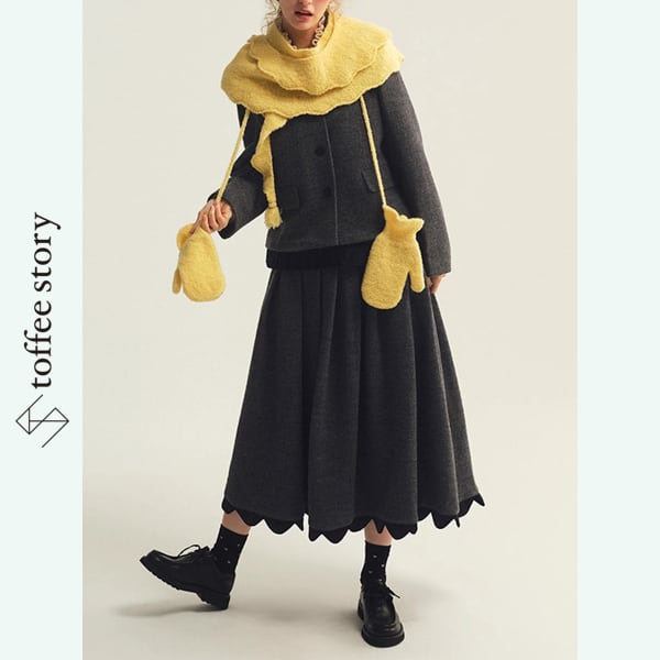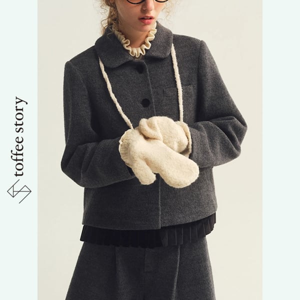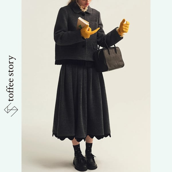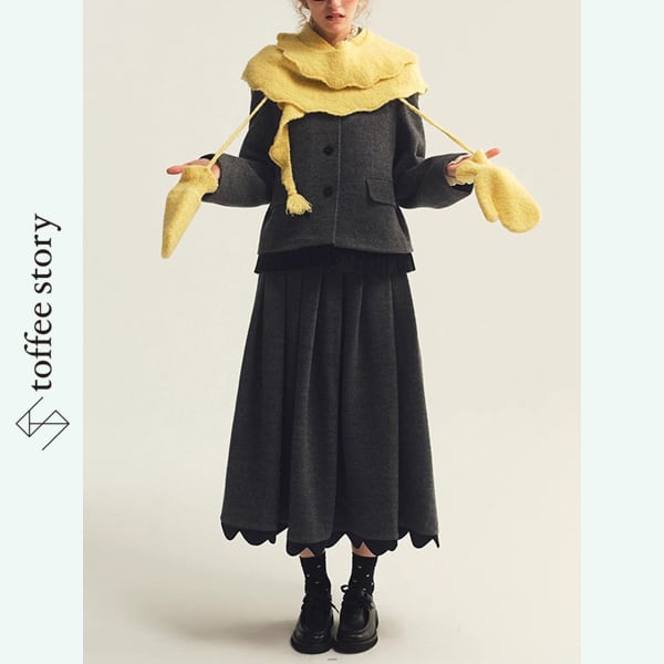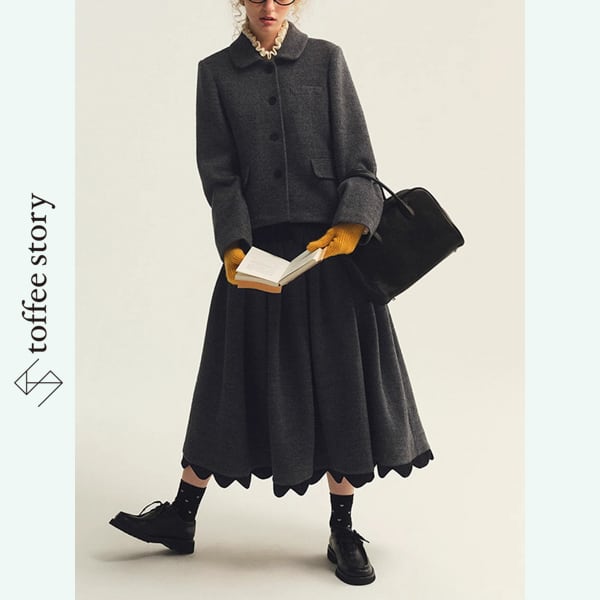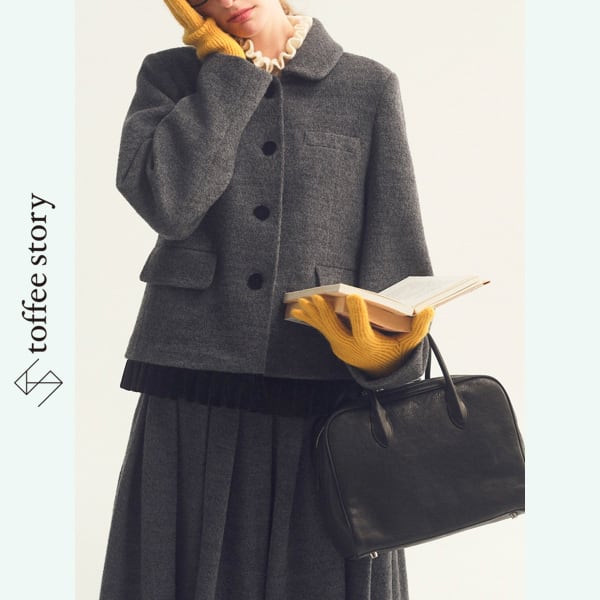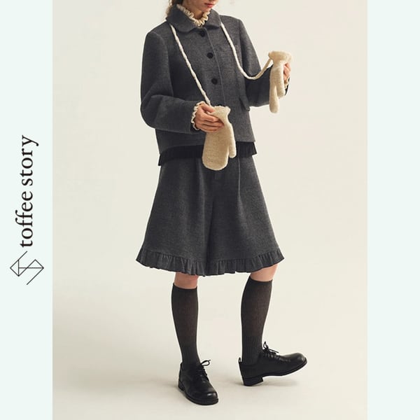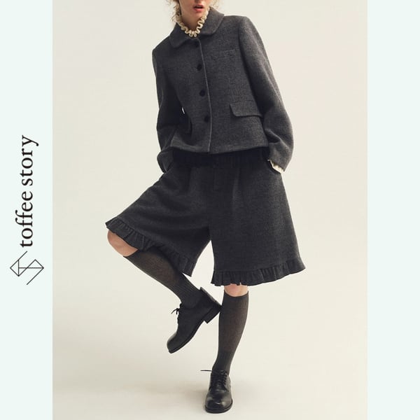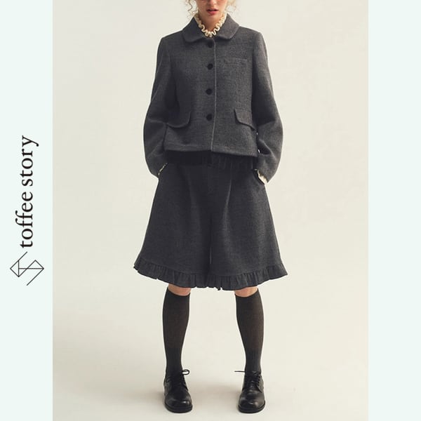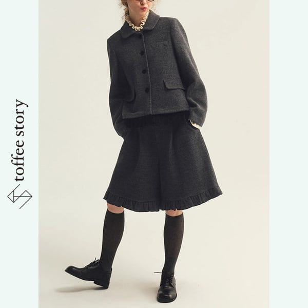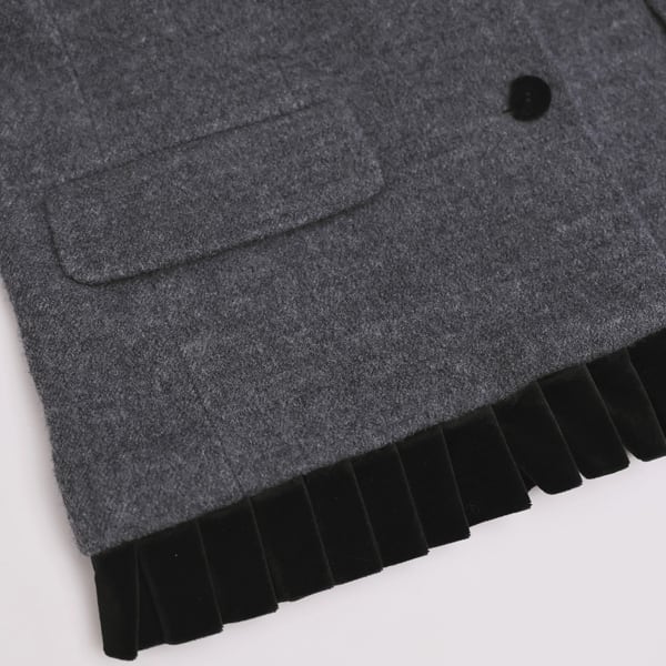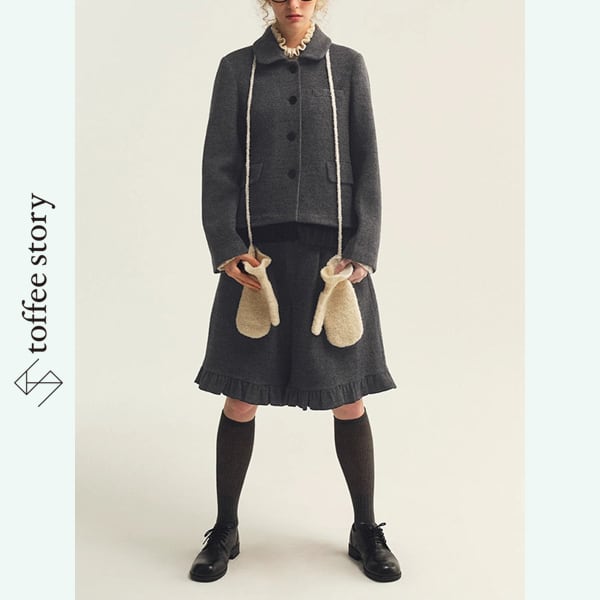 ダークグレーのショートコートは、裾に配されたブラックの襞が印象的。大きめの黒ボタンが並び、上品な存在感を放ちます。
