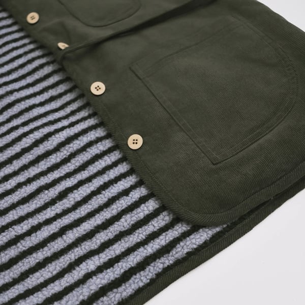 ふわふわとしたストライプ面と、もう一方のオリーブグリーン・コーデュロイ面。異なる質感がひとつの物語を紡ぐリバーシブル仕様です。左右に配した大きなポケットと、左胸の小さなパッチポケットがアクセントになり、日常の中の小さな冒険を思わせます。