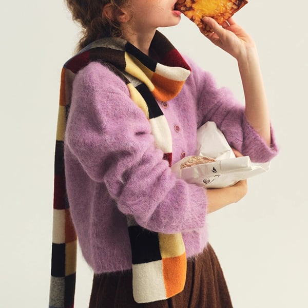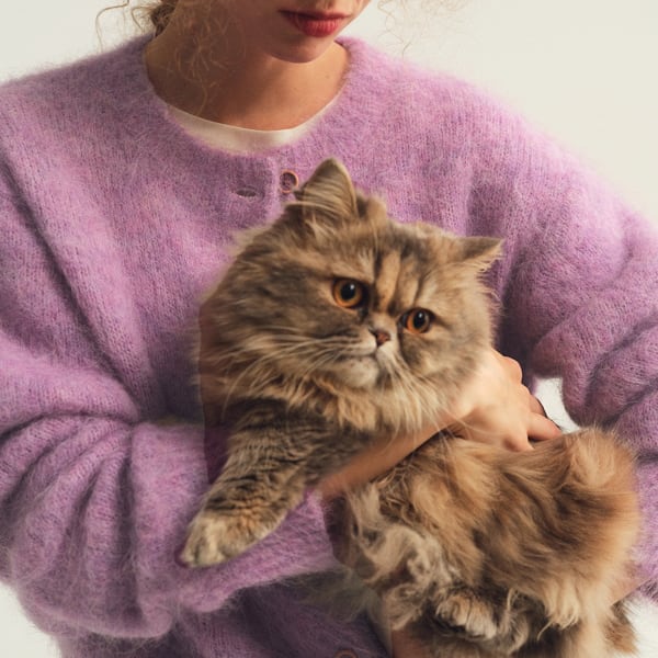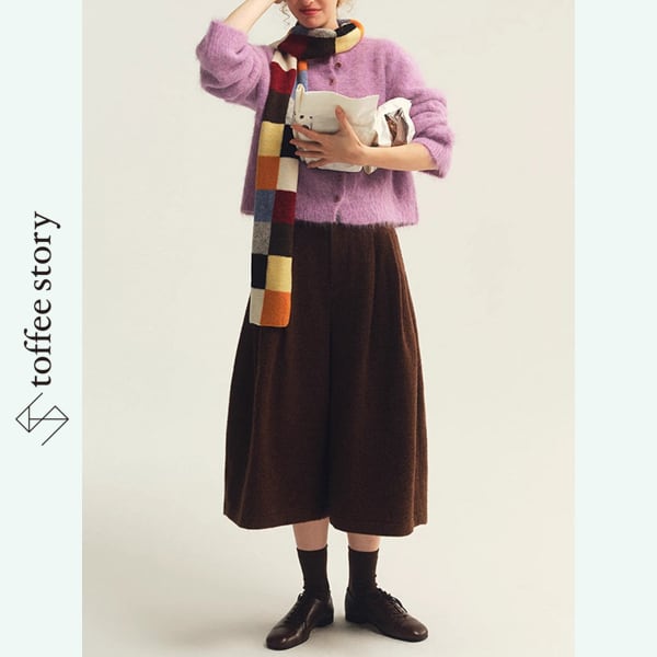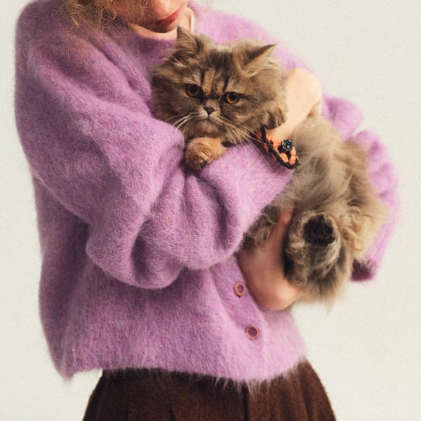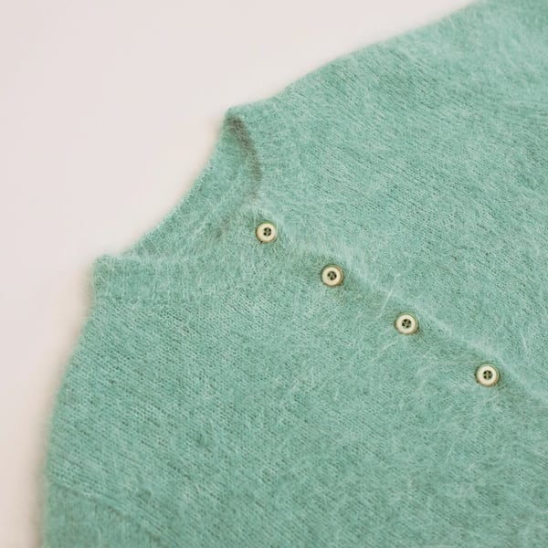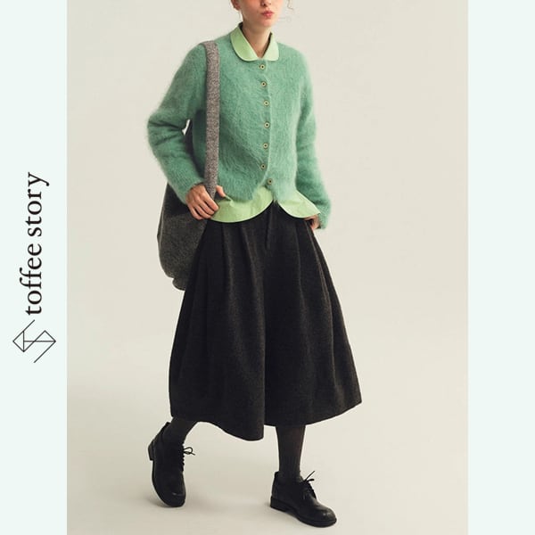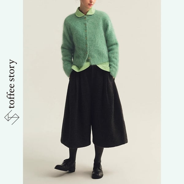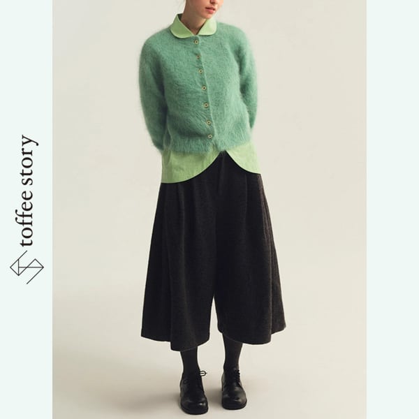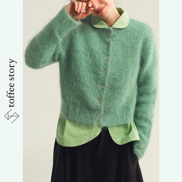 ふわふわとした質感が愛らしいショート丈カーディガンは、ミントグリーンとパープルの2色で展開。コロンとしたフロントボタンがクラシックな可憐さを添えます。