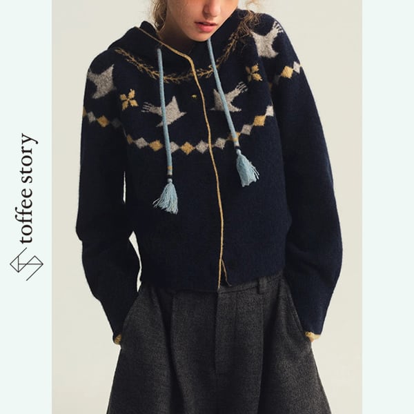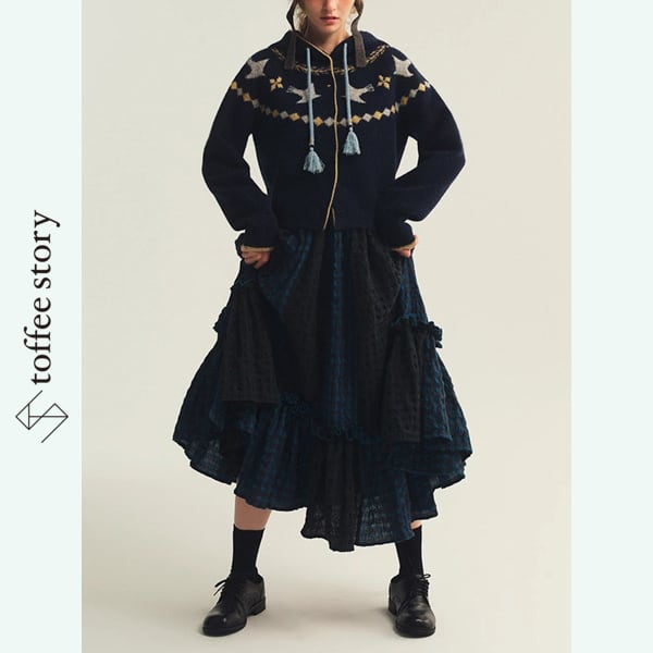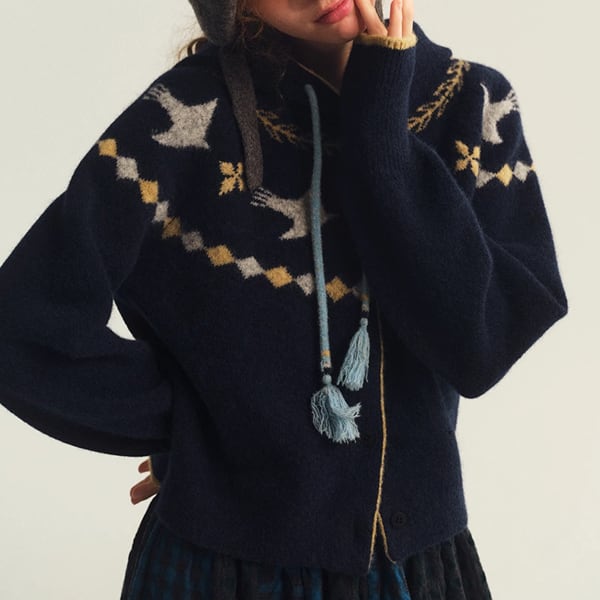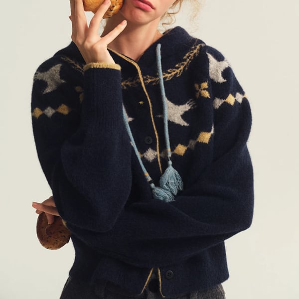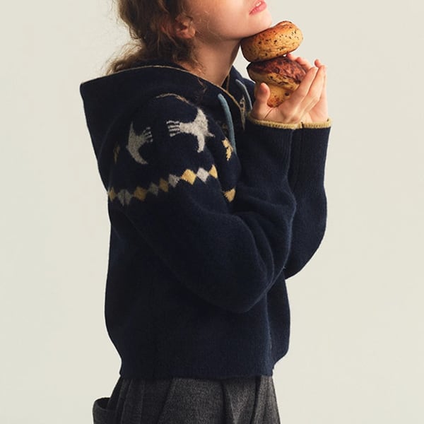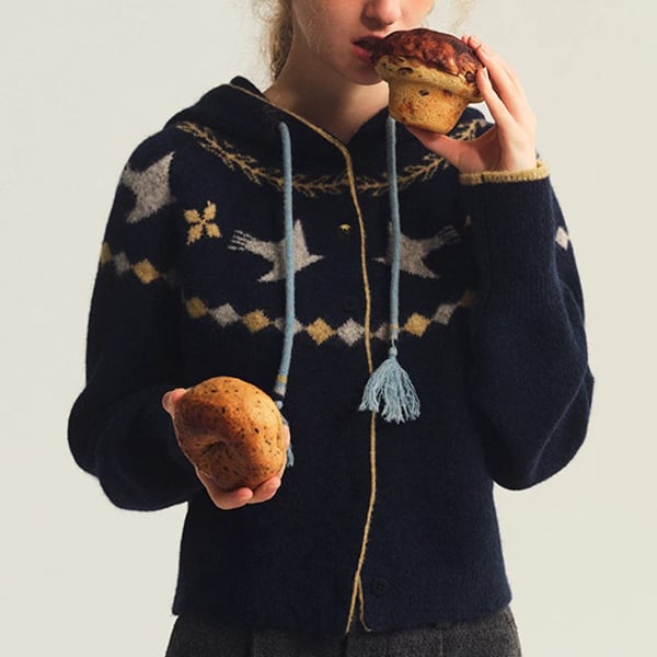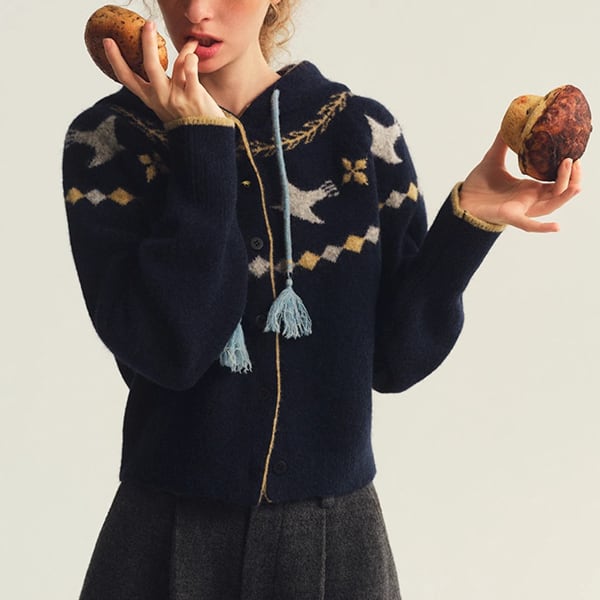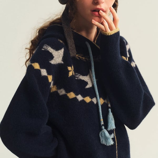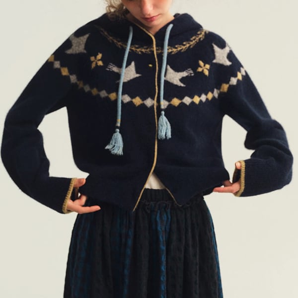 星空と鳥が織り込まれた詩的なデザインのニットフーディーは、着る人の心に小さな物語を灯します。フロントのドローストリングには繊細なタッセルをあしらい、軽やかに揺れるたびにリズムを奏でるよう。