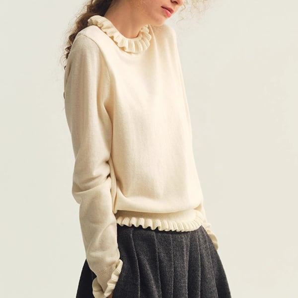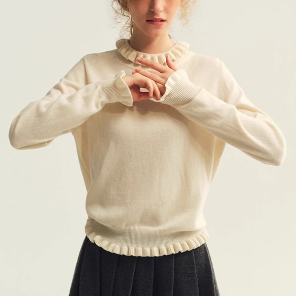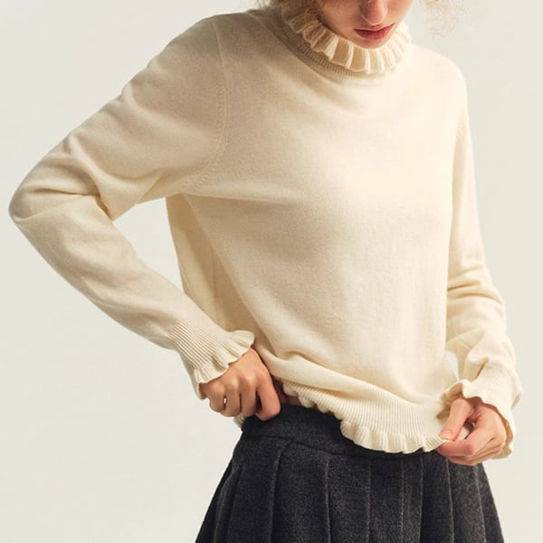 襟もと・裾・袖口にあしらわれたクシュクシュのディテールが、動くたびにふわりと表情を変えるハイネックニットトップです。ショート丈のバランスが軽やかで、ケープやショートコートなどとのレイヤードにもぴったり。