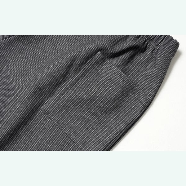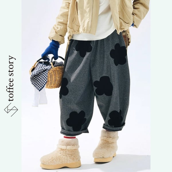 細かなチェック柄をベースに、大きな黒いお花のアップリケがぽんっと咲いた、imakokoniらしい“遊び心満開”のキャロットパンツ。