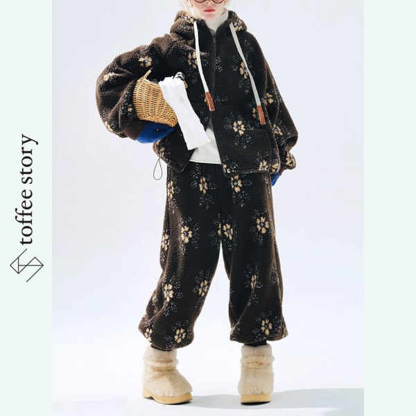ダークブラウンのもこもこ生地に、白いお花がふわりと咲き広がるアートなフリースパンツ。フレンチテイストの可愛らしさと、imakokoniらしい遊び心が絶妙に調和し、シンプルなトップスを合わせるだけで主役級の存在感に。