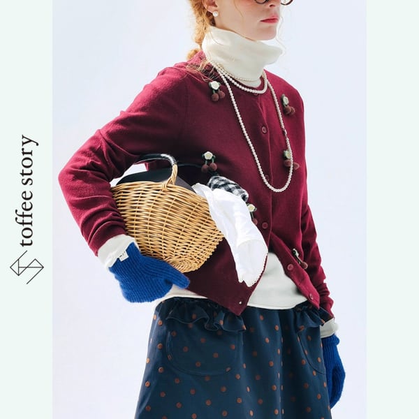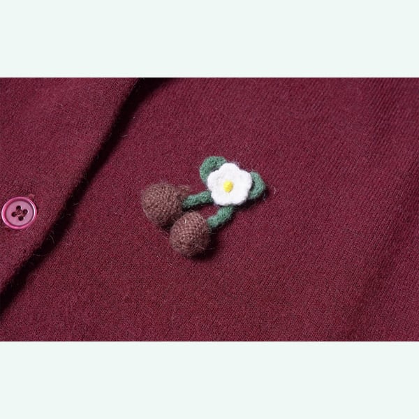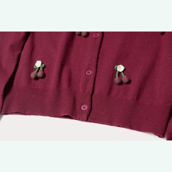 深みのあるバーガンディに、ぽんっと可愛らしく咲いたサクランボ装飾が目を惹く、imakokoniらしいアートなニットカーディガン。