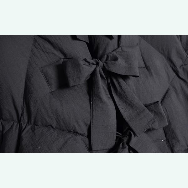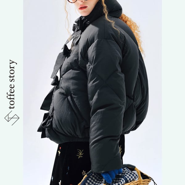 シックなブラックに、同色の大きなリボンが縦に4つ並ぶ、imakokoniらしい遊び心あふれるクロップドダウン。