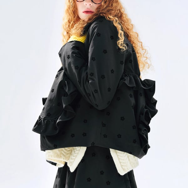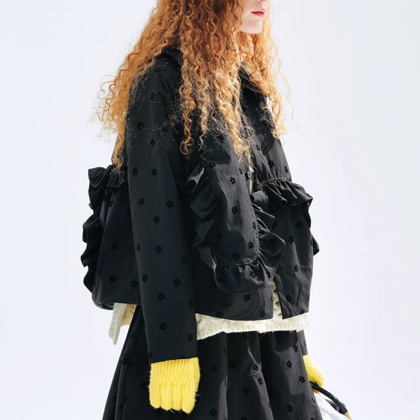 フロントにもバックにも不規則に流れるフリルをあしらい、動きに合わせてふわりと揺れるアートなクロップドジャケット。