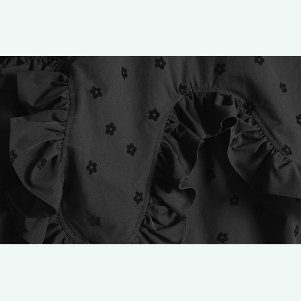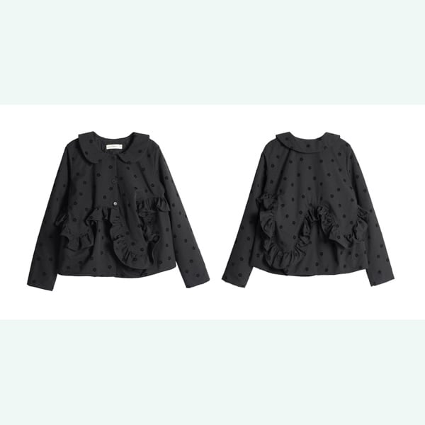 ピーターパンカラーが愛らしく、ダークグレーに散る小さな黒いお花がどこか物語の一幕のよう。