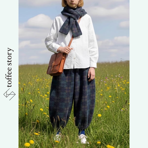 グリーンをベースにした独特のチェック柄に、もこもことした温かな素材感がマッチしたキャロットパンツ。